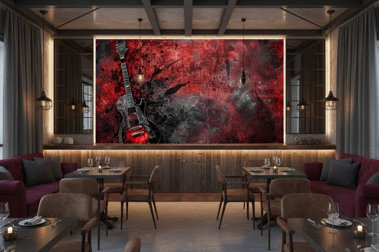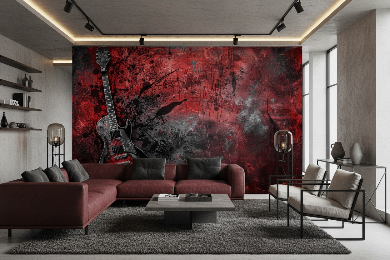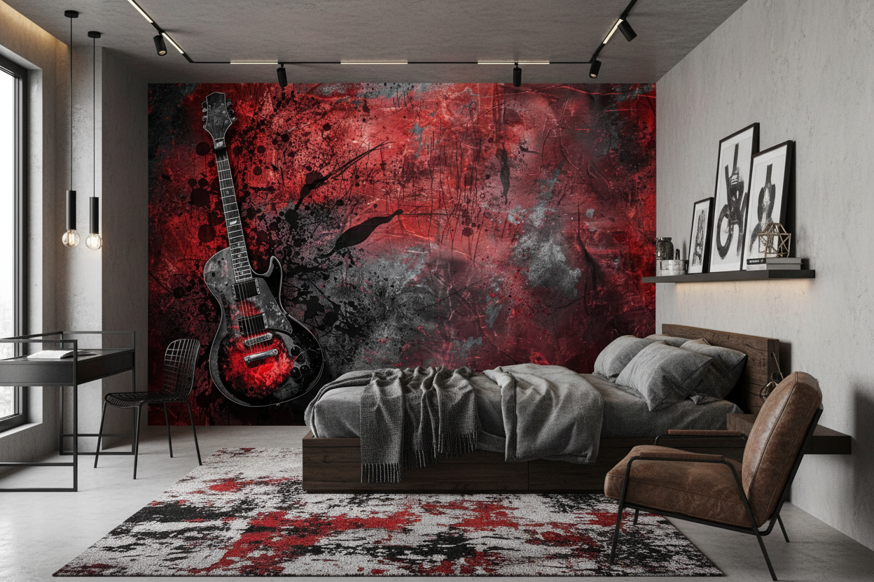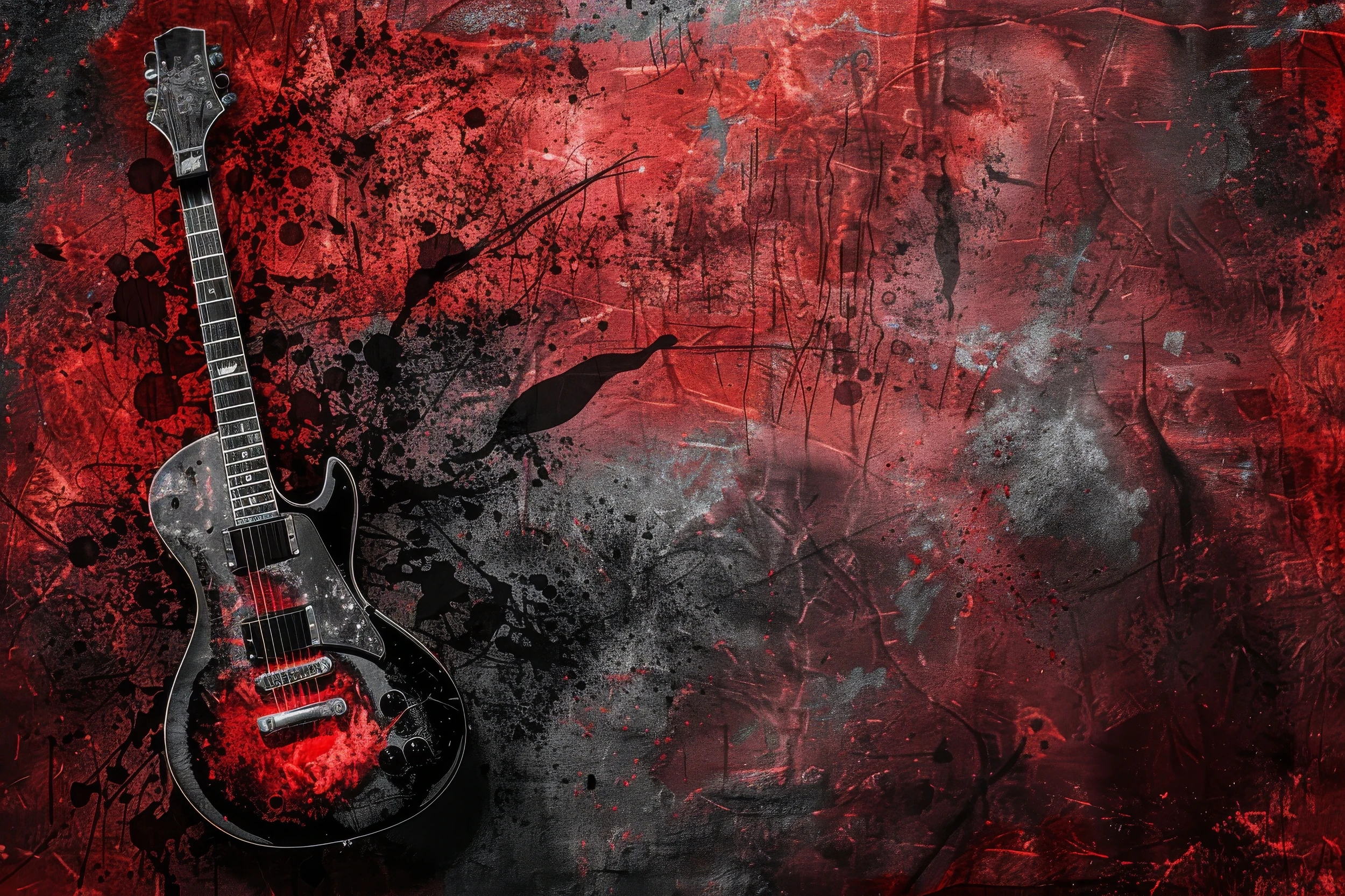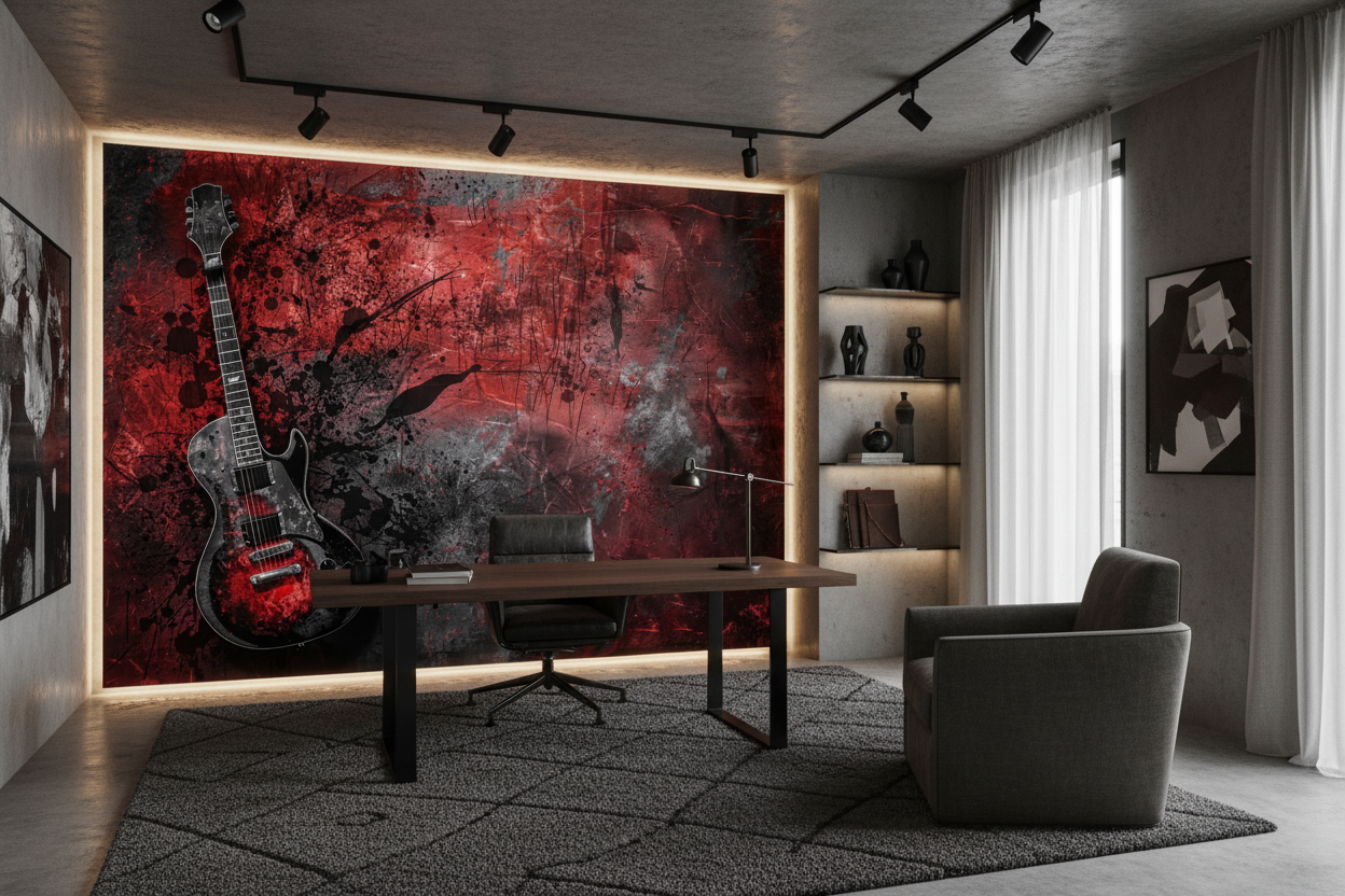 Ce papier peint musical grunge révèle dans toute sa splendeur une guitare électrique noire aux reflets métalliques, majestueusement positionnée sur la gauche de la composition. L’instrument, d’un réalisme saisissant, arbore un style rock authentique avec ses cordes tendues et ses chromes étincelants qui captent la lumière rouge incandescente. Le fond, véritable chef-d’œuvre graphique, déploie un univers abstrait rouge et noir d’une intensité dramatique remarquable.
