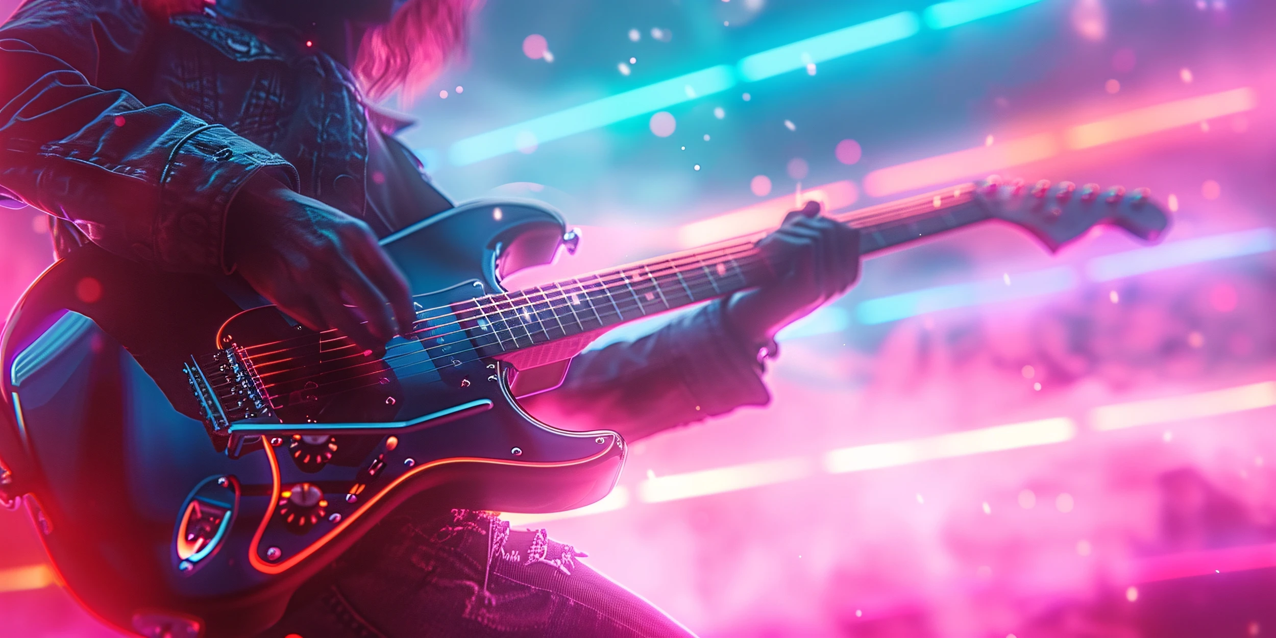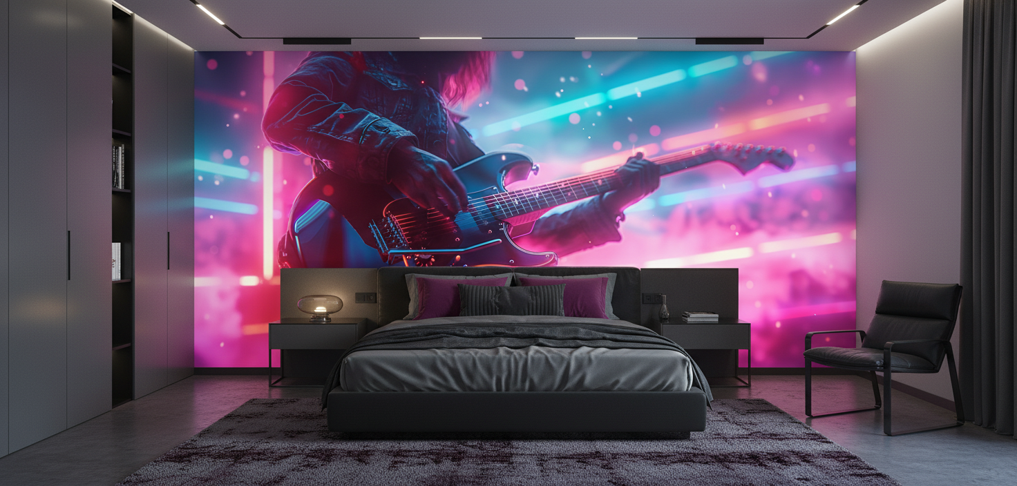 Ce papier peint musical capture l’instant magique d’un solo de guitare électrique dans une explosion de couleurs néon saisissante. Au premier plan, une guitare électrique noire aux reflets métalliques se détache majestueusement, ses cordes semblant vibrer sous l’effet des éclairages scéniques. Le musicien, vêtu d’une veste en cuir authentique, incarne parfaitement l’âme rebelle du rock. L’arrière-plan se compose d’un dégradé spectaculaire mêlant les bleus électriques, les roses fuchsia et les violets profonds, rappelant l’atmosphère enivrante des concerts live. Des particules lumineuses flottent dans l’air comme des notes de musique cristallisées, créant un effet cinématographique d’une beauté hypnotique.