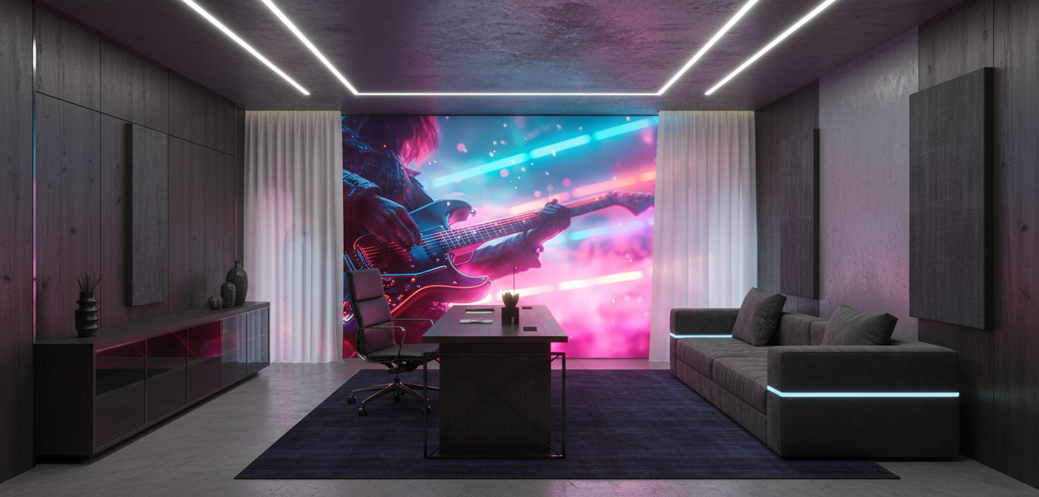 Ce papier peint musical moderne trouve sa place idéale dans un salon contemporain, une chambre d’adolescent passionné de musique, un bureau créatif ou encore un studio d’enregistrement. Il s’harmonise parfaitement avec un mobilier aux lignes industrielles, des matières comme l’acier brossé, le cuir vintage et le bois sombre. Associez-le à des luminaires design aux formes géométriques et à des accessoires métalliques pour créer un univers loft urbain. Les teintes neutres comme le gris anthracite, le noir mat ou le blanc pur feront ressortir la richesse chromatique de cette fresque murale.