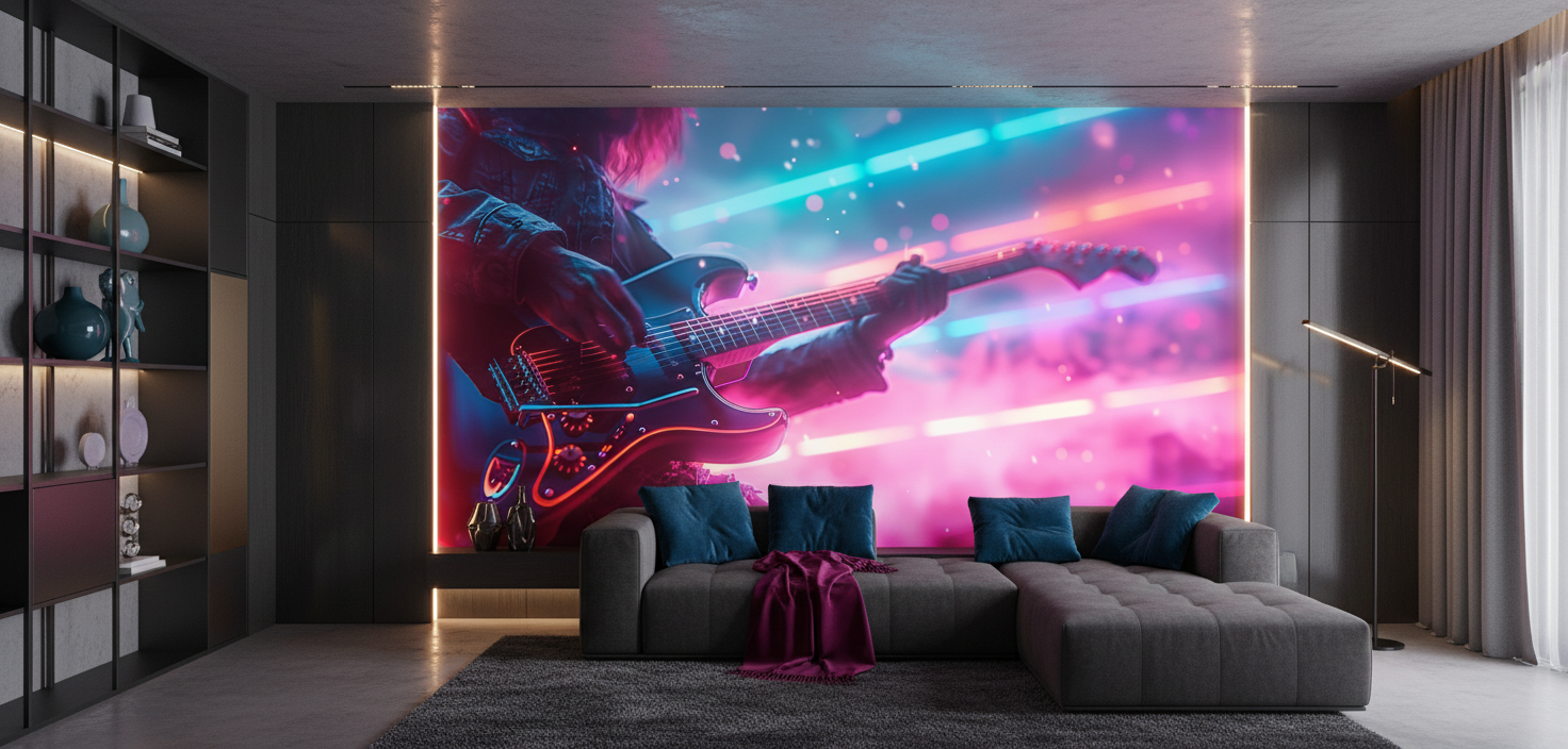 Plongez dans l’univers électrisant de la musique rock où les vibrations colorées dansent au rythme des cordes tendues, transformant votre espace en une véritable scène de concert baignée de lumières psychédéliques.