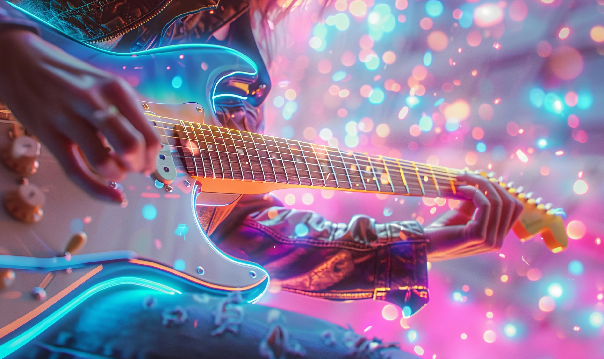 Les cordes vibrent sous les doigts, et soudain l’espace tout entier se métamorphose en une symphonie de lumières colorées et d’énergie pure, où chaque note semble danser dans un kaléidoscope infini de reflets chatoyants.
