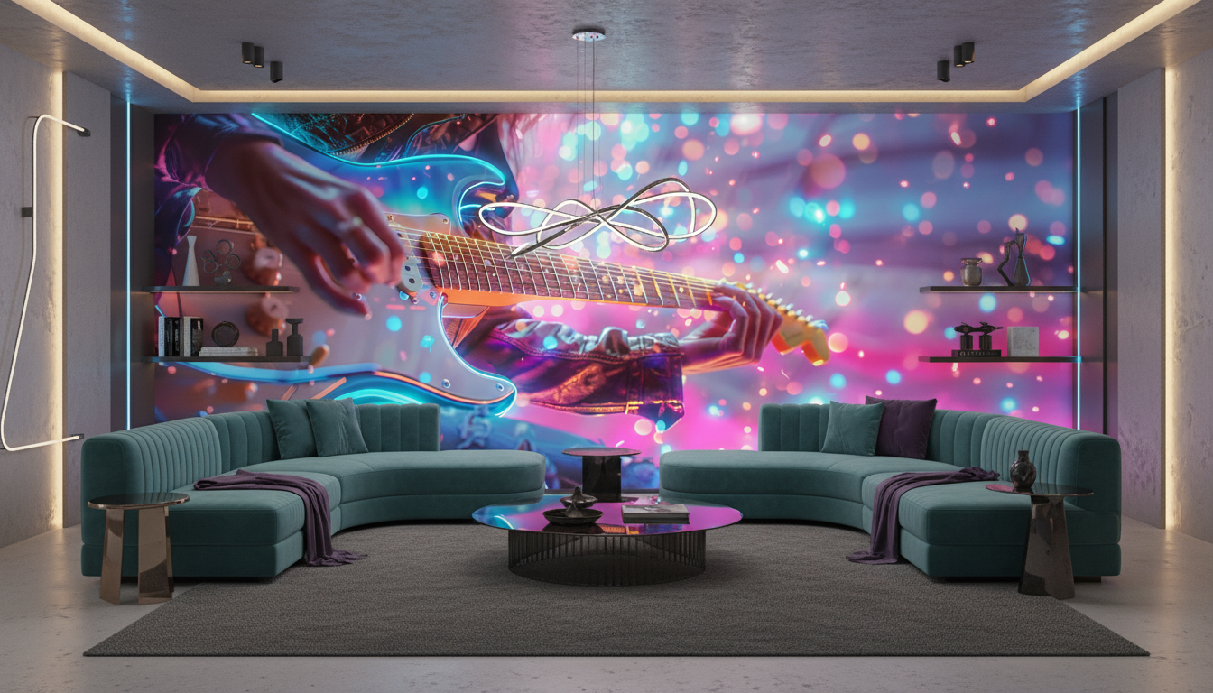 Idéal pour sublimer un studio de musique, une chambre d’adolescent passionné de rock, ou encore un salon contemporain aux accents créatifs, ce papier peint moderne s’harmonise parfaitement avec un mobilier aux lignes épurées. Associez-le à des matières industrielles comme le métal brossé, le cuir noir ou le bois sombre pour créer une ambiance loft authentique. Des éclairages LED colorés ou des spots directionnels viendront magnifier les reflets et prolonger l’effet visuel du papier peint.