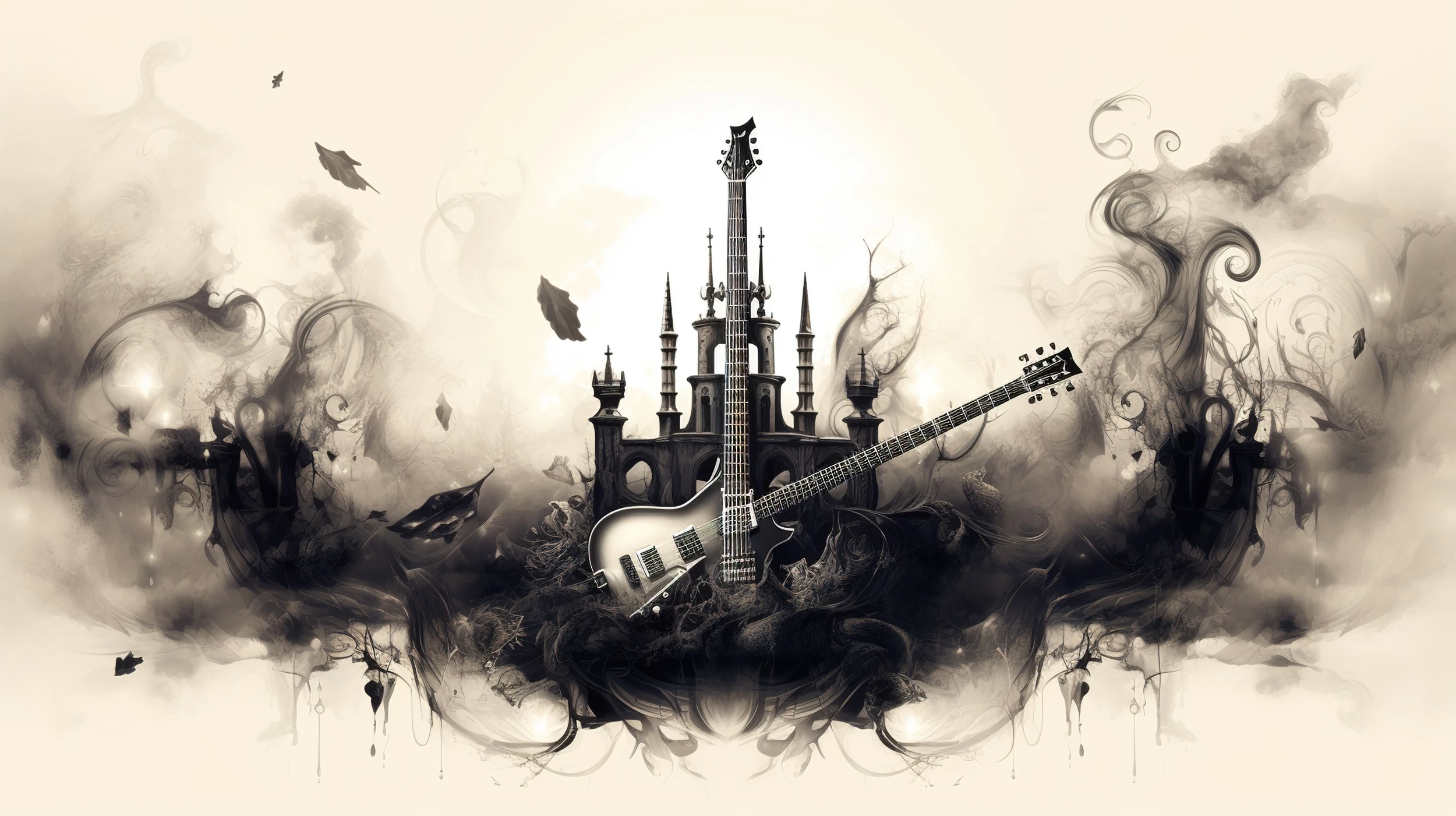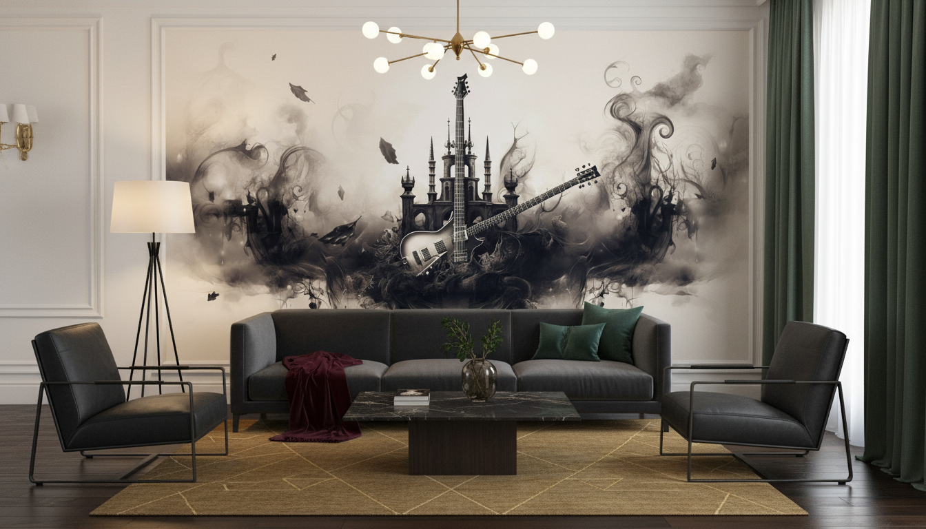 Plongez dans un univers rock gothique et raffiné. Ce papier peint sur mesure met en scène guitares, château et volutes en noir et blanc. Créez une ambiance mystérieuse et artistique pour votre intérieur. Idéal pour salon, chambre ou studio de musique.