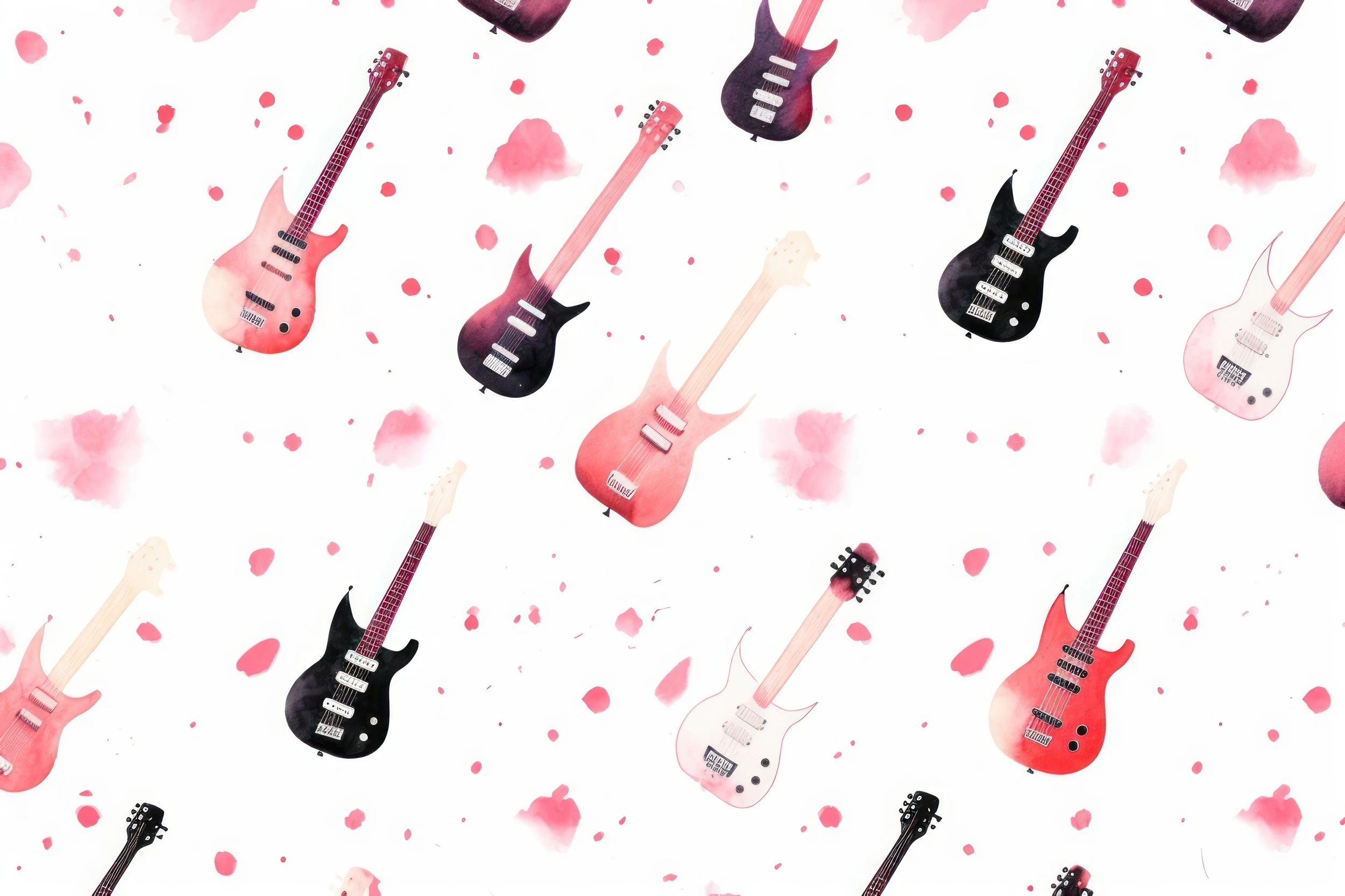 Ce papier peint musical dévoile une symphonie d’instruments à cordes aux silhouettes élégantes, alternant entre guitares électriques roses et modèles noirs profonds. Chaque instrument se dessine avec une précision graphique remarquable, révélant pickups argentés, cordes délicatement tracées et manches aux détails saisissants. La technique d’illustration mêle aquarelle moderne et design vectoriel, créant un rendu à la fois artistique et contemporain.
