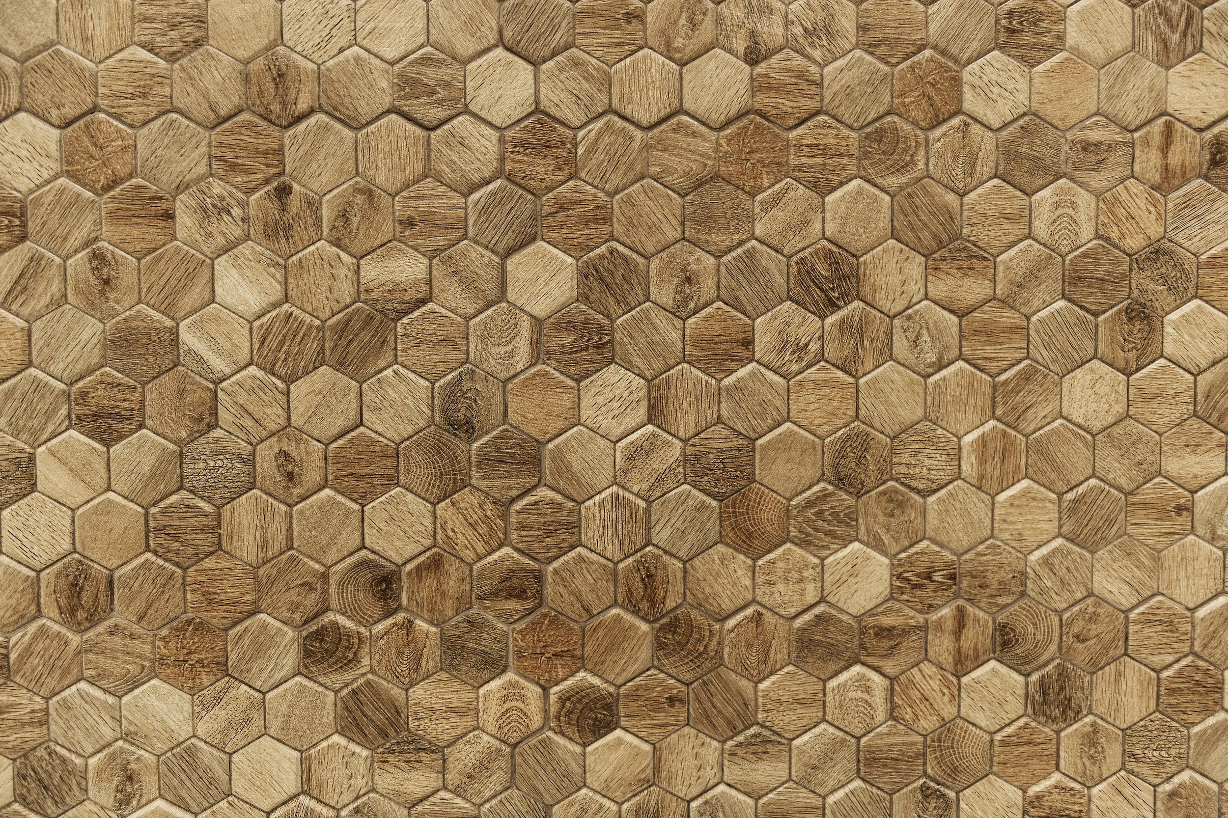 Plongez dans l’univers fascinant d’un papier peint géométrique où la nature rencontre l’art décoratif le plus raffiné. Cette composition hypnotique révèle un pavage d’hexagones en bois naturel, créant une mosaïque précieuse qui évoque à la fois l’architecture des ruches et la beauté brute des matériaux authentiques.