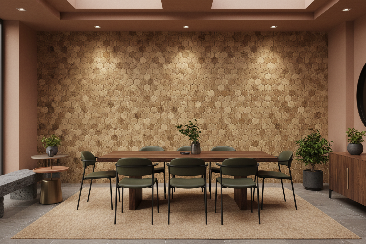 Associez ce revêtement mural hexagonal avec des mobiliers aux lignes épurées : une table basse en chêne massif, des luminaires en laiton brossé, ou encore des coussins dans les tons terre de Sienne. Les matières comme le cuir vieilli, le rotin tressé et les métaux patinés créent un dialogue harmonieux avec les nuances boisées de ce papier peint d’exception. Pensez également aux plantes vertes qui, par leur feuillage, rappellent l’inspiration végétale de cette structure alvéolaire.
