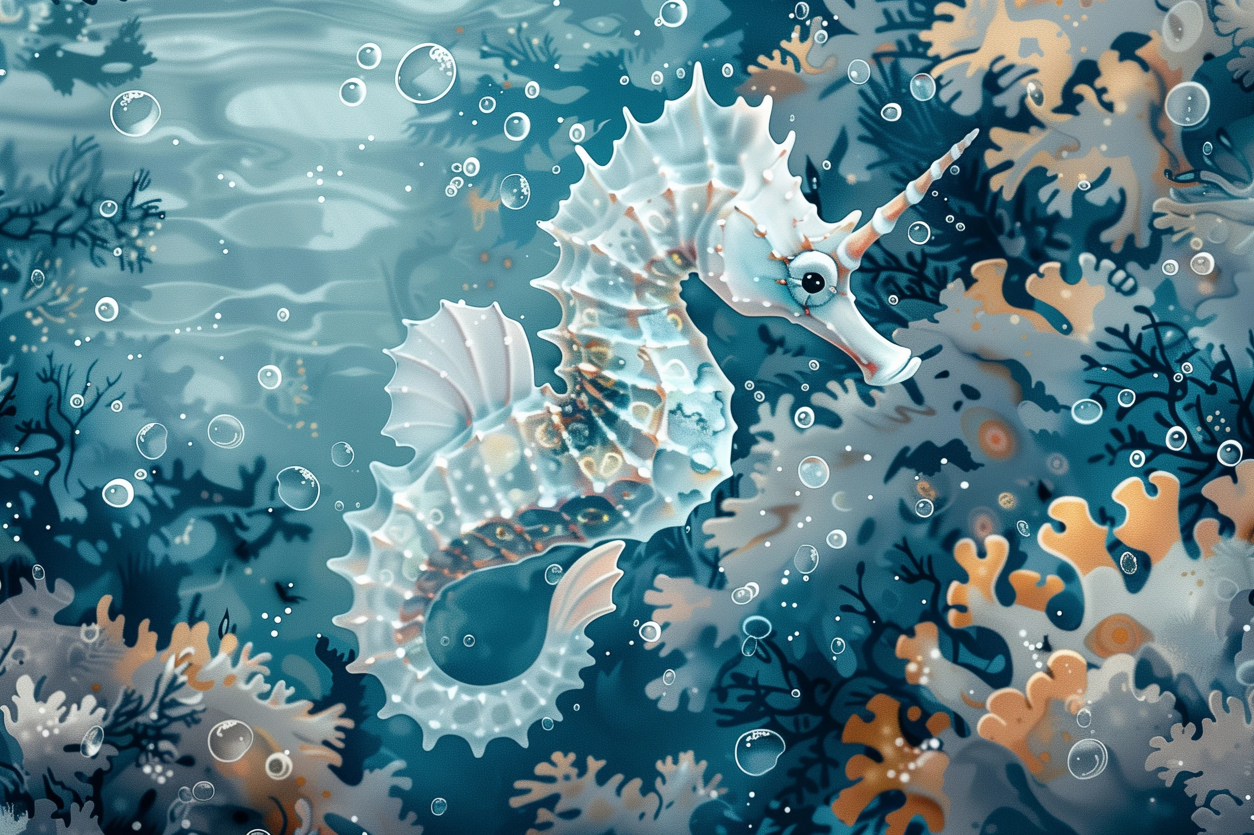 Ce papier peint aquatique révèle un hippocampe translucide aux reflets opalescents, sublimé par une technique de peinture numérique d’une finesse remarquable. Les tons bleu océan se déclinent en nuances subtiles, du turquoise profond au blanc nacré, ponctuées de touches dorées qui évoquent les rayons du soleil filtrant à travers les eaux cristallines. Des coraux stylisés aux formes organiques encadrent gracieusement la scène, tandis que des bulles d’air de différentes tailles créent un mouvement hypnotique qui anime l’ensemble de la composition.