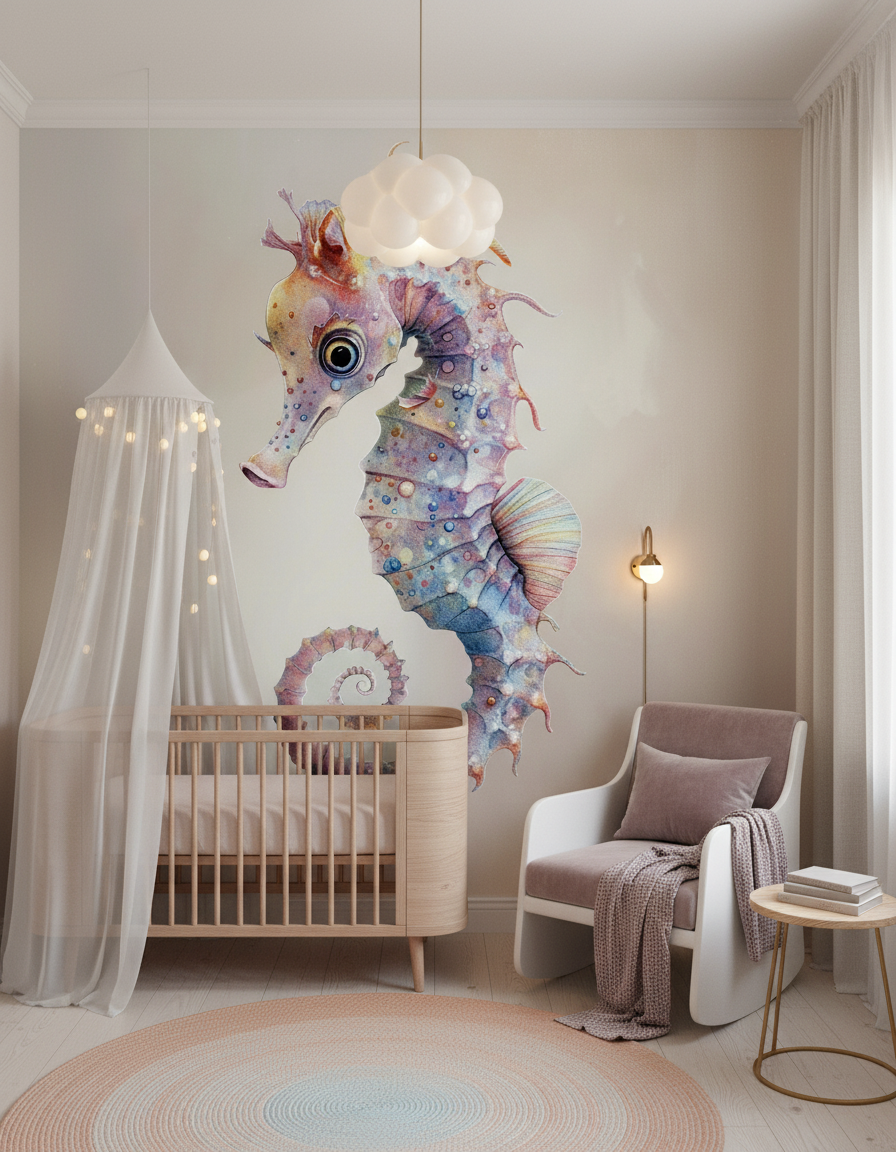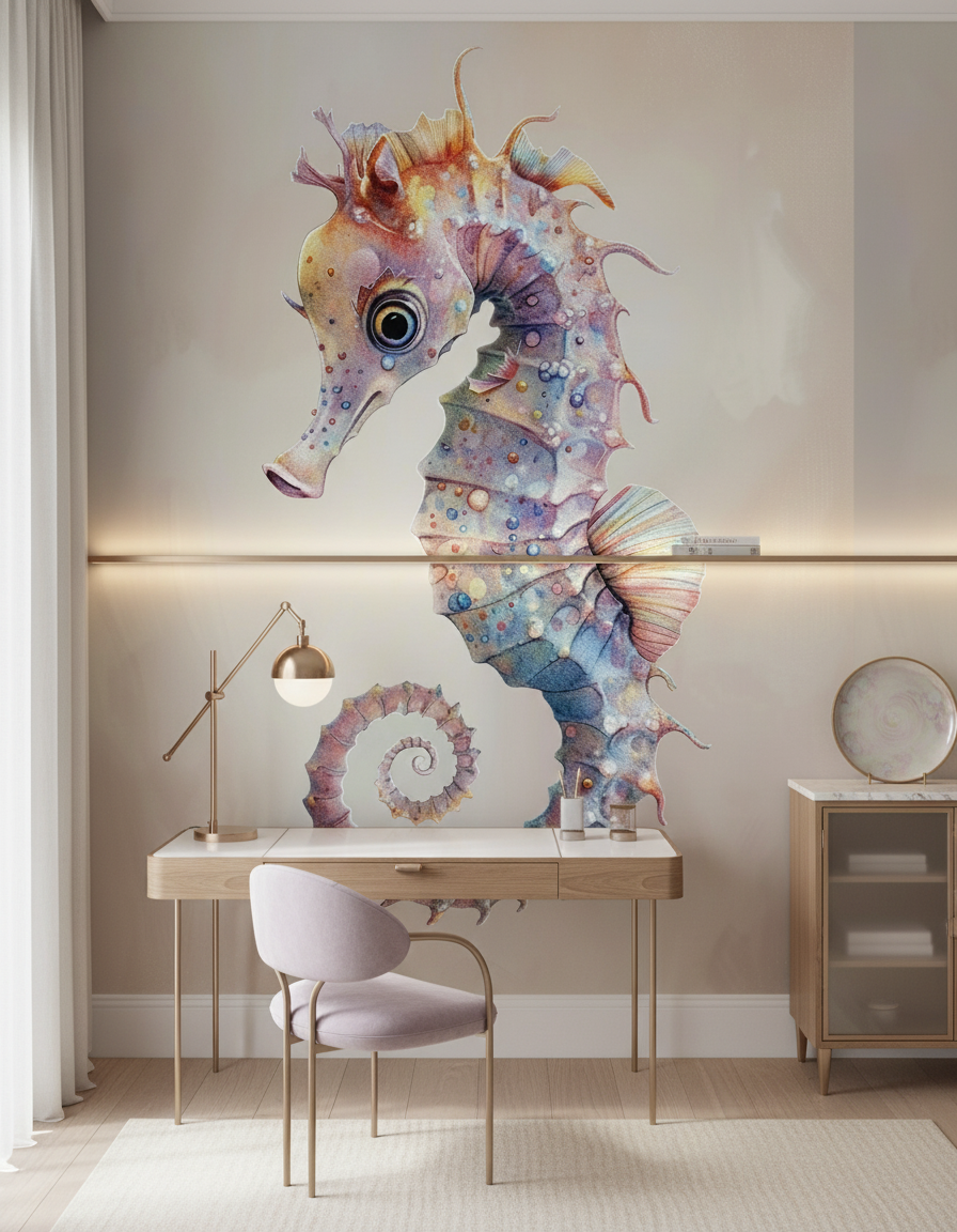 Associez ce revêtement mural artistique à des matières naturelles : bois flotté, lin blanc cassé, coton bio dans les tons crème. Des accessoires en laiton doré ou en céramique blanche viendront faire écho aux reflets dorés de l’hippocampe. Complétez l’ambiance avec des plantes tropicales aux feuillages arrondis et des luminaires en rotin naturel pour créer une harmonie coastal living raffinée.