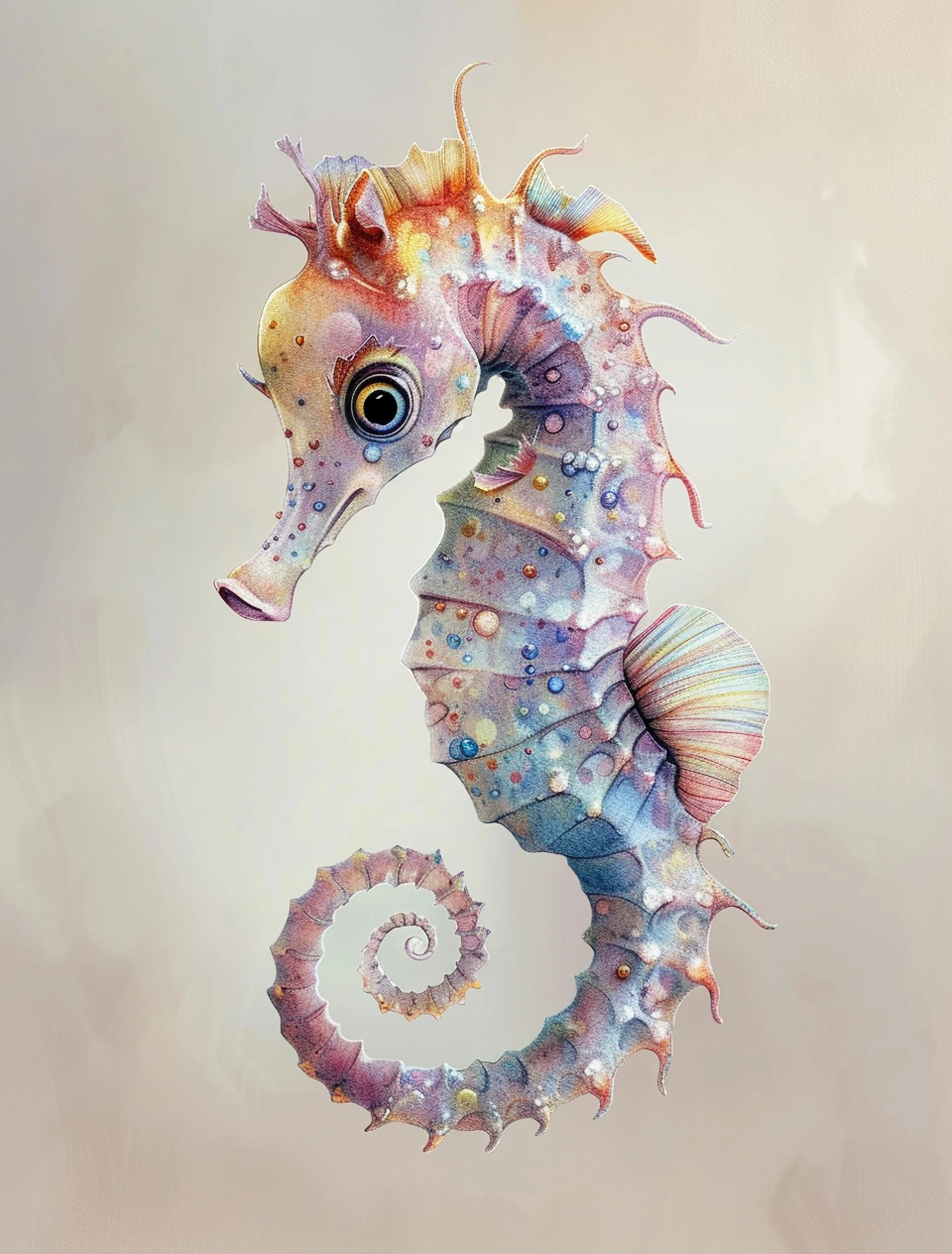 Ce papier peint artistique dévoile un magnifique hippocampe aux couleurs irisées, véritable chef-d’œuvre d’aquarelle contemporaine. Sa silhouette gracieuse se pare d’une palette chromatique exceptionnelle, mêlant des tons pastel délicats – roses poudrés, violets tendres, bleus azur et touches dorées – qui évoquent les reflets chatoyants des fonds marins baignés de lumière. Les détails minutieux révèlent une texture perlée parsemée de petites bulles translucides, tandis que sa queue spiralée et ses nageoires délicates semblent danser dans un ballet aquatique éternel.