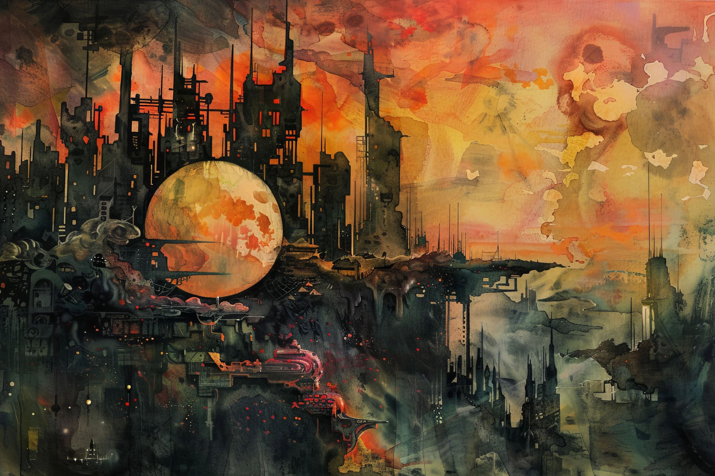 Ce papier peint futuriste déploie un paysage urbain dystopique d’une richesse visuelle extraordinaire. Au cœur de cette composition, une lune cuivrée imposante trône majestueusement au-dessus d’une cité industrielle aux silhouettes géométriques complexes. Les cheminées d’usines s’élancent vers un ciel tourmenté, tandis que des structures métalliques et des tours futuristes dessinent un horizon urbain dense et mystérieux.