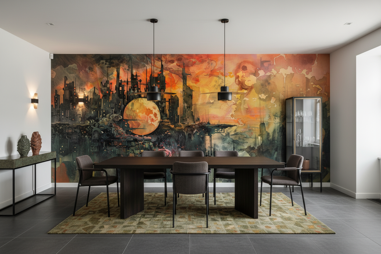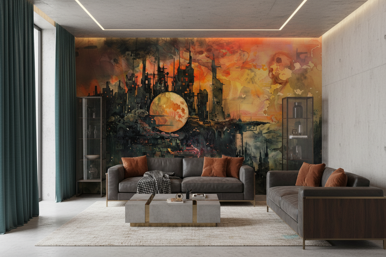 Ce papier peint industriel trouve sa place idéale dans un bureau moderne, un salon contemporain ou une chambre d’adolescent passionné d’univers futuristes. Il s’harmonise parfaitement avec un mobilier aux lignes épurées, des matières comme l’acier brossé, le béton ciré ou le cuir noir. Associez-le à des éclairages LED aux tons chauds pour accentuer l’effet dramatique, ou à des accessoires en cuivre et laiton pour rappeler les nuances métalliques de l’œuvre.