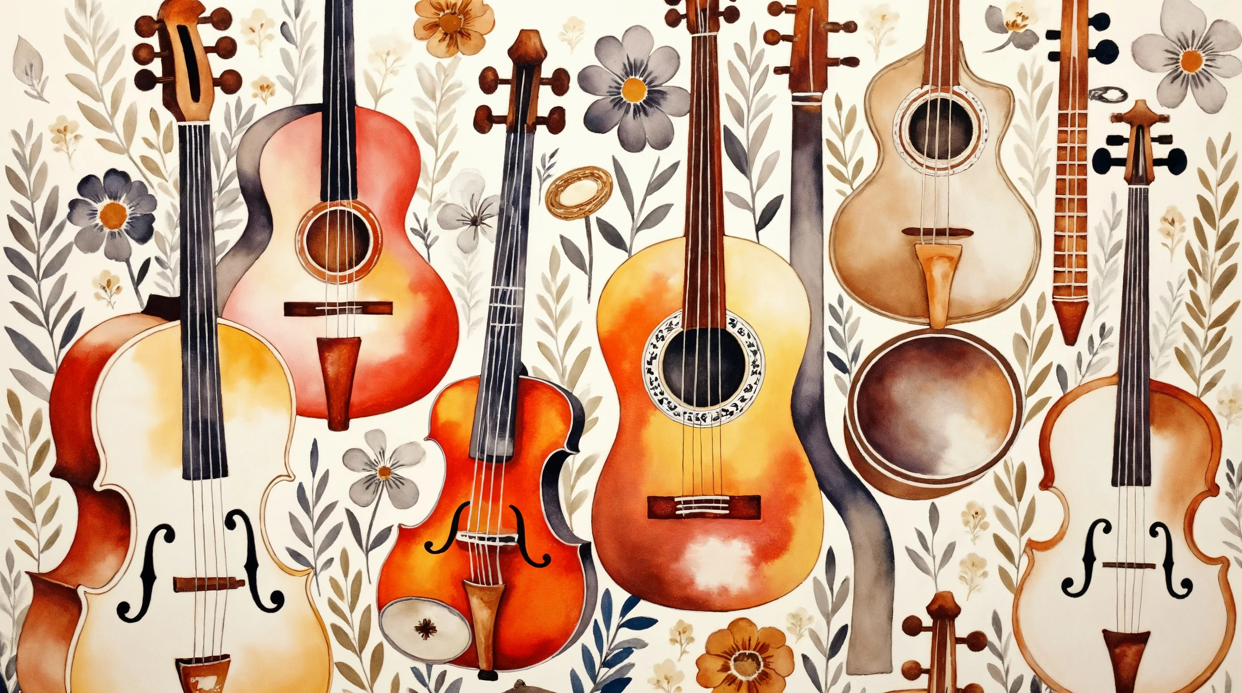 Ce papier peint musical dévoile un univers artistique d’une rare élégance, où violons, guitares classiques, mandolines et contrebasses se mêlent dans une composition équilibrée et raffinée. Chaque instrument, peint à l’aquarelle avec des tons chauds allant de l’ocre doré au brun profond en passant par des nuances orangées, révèle les détails minutieux de son artisanat : cordes tendues, chevilles finement sculptées, rosaces ornementées et vernis patinés par le temps. Entre ces instruments à cordes, une végétation stylisée aux tons neutres et poudrés s’épanouit délicatement, parsemée de fleurs vintage aux pétales nacrés et de feuillages graphiques qui apportent une douceur poétique à l’ensemble.