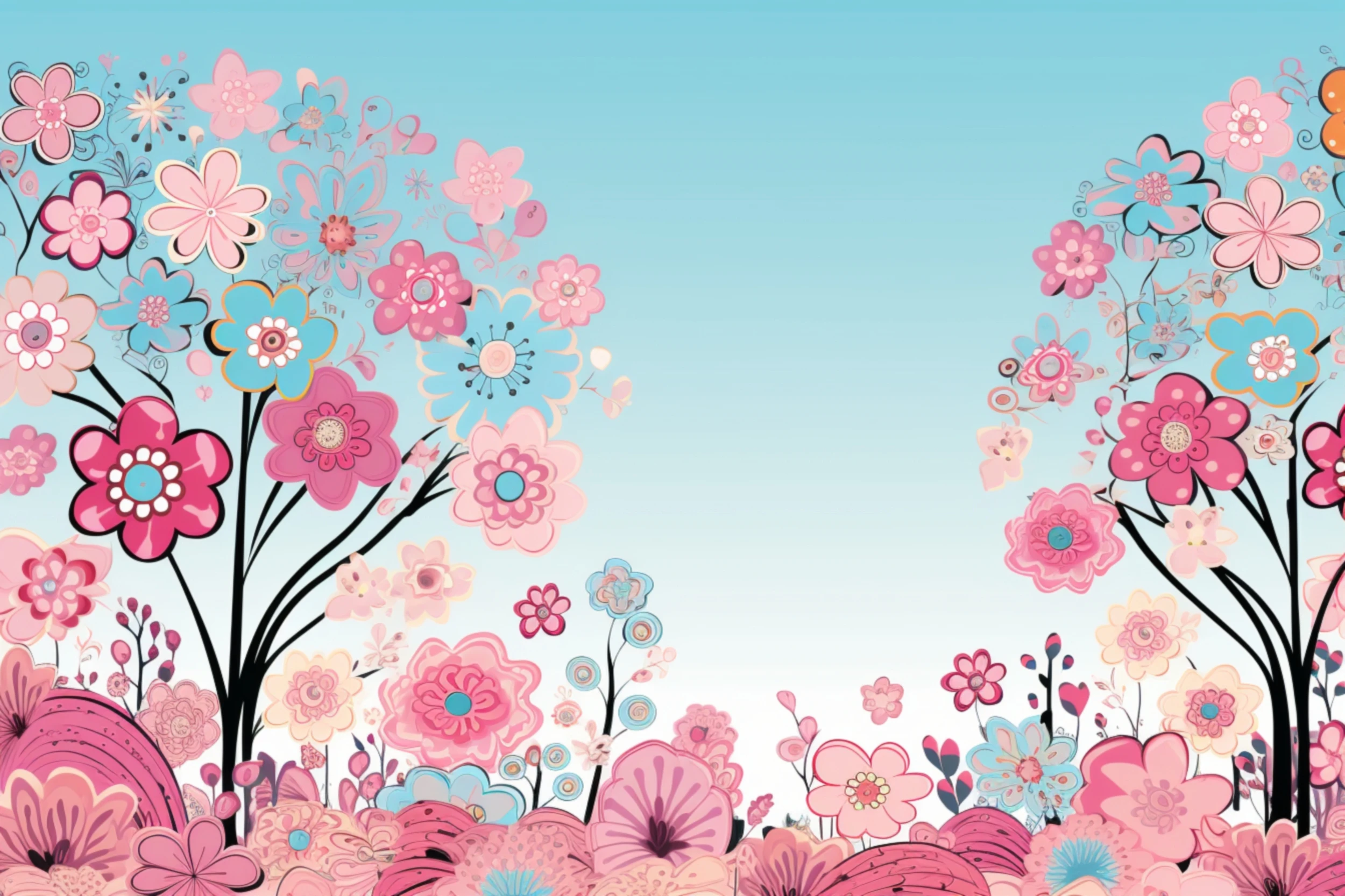 Papier peint sur mesure : un jardin fleuri rose et bleu pastel. Créez une ambiance poétique et douce, inspirée du design scandinave. Des fleurs stylisées pour un intérieur unique et apaisant.