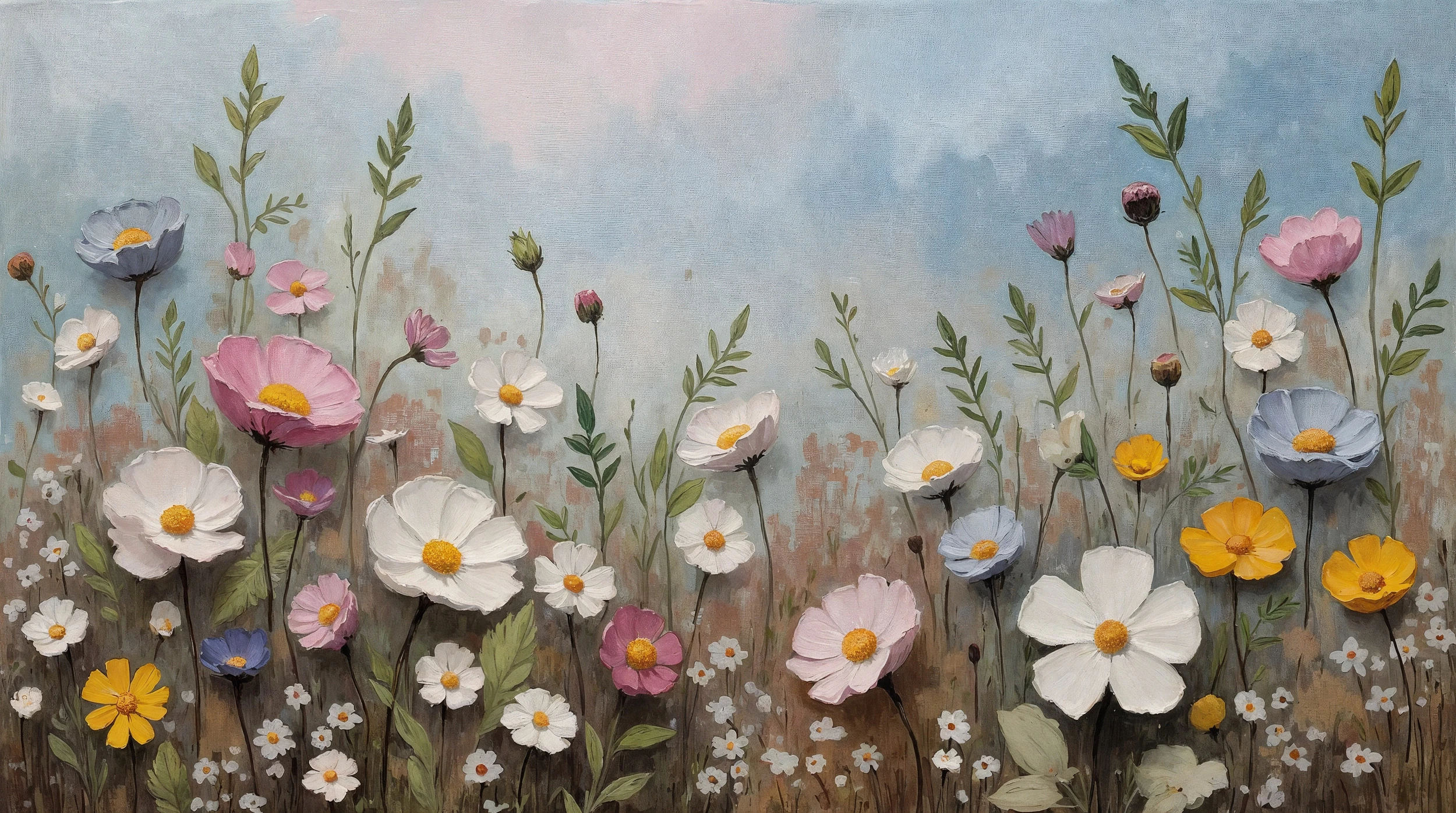 L’œuvre se distingue par sa technique picturale raffinée, mélange subtil entre aquarelle délicate et peinture à l’huile. Le fond nuageux aux tons pastel – bleu ciel, rose poudré et beige naturel – évoque un ciel changeant qui confère une profondeur atmosphérique remarquable. Les couleurs douces et la palette naturelle créent une harmonie chromatique apaisante, parfaite pour un papier peint romantique.