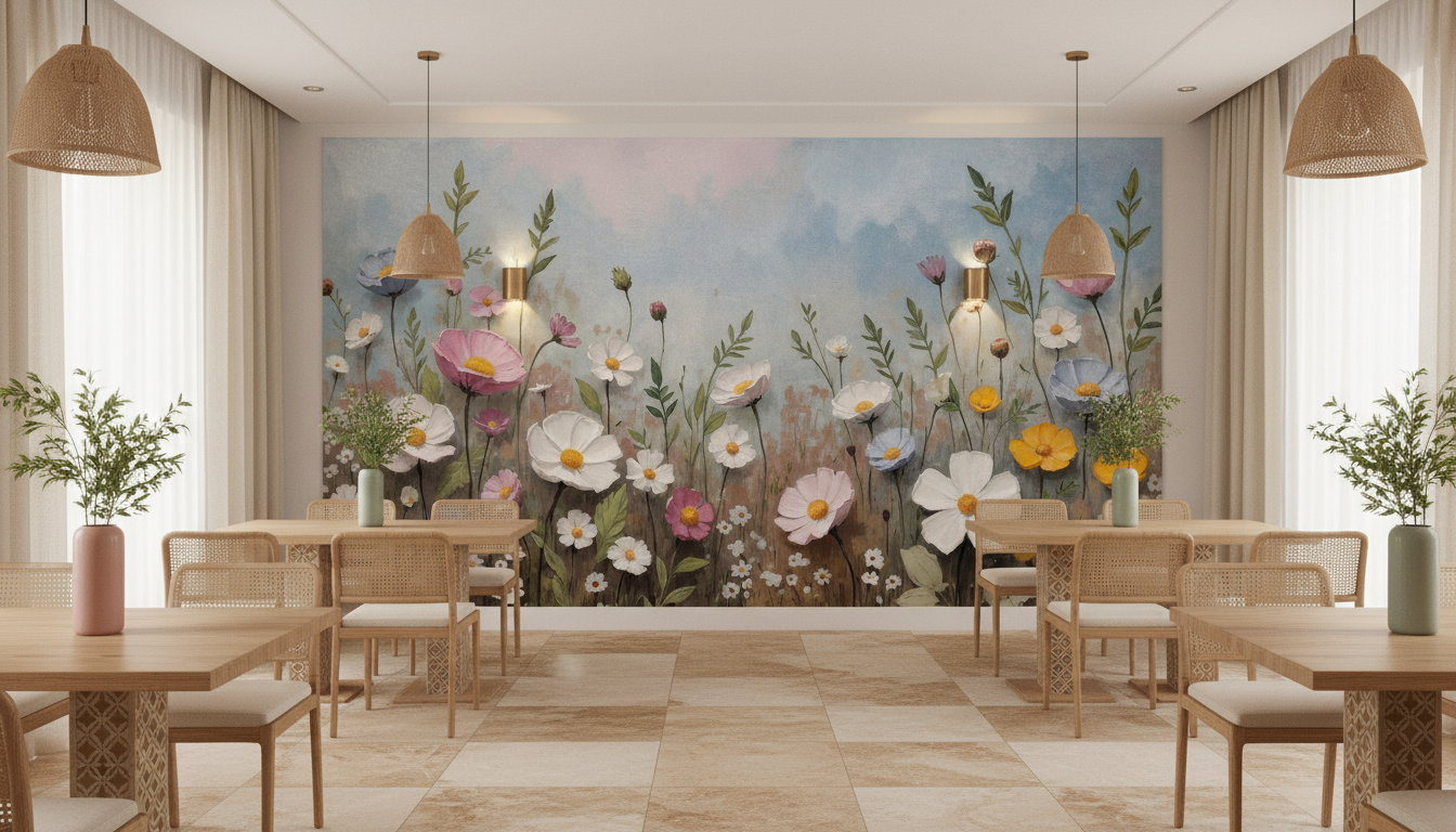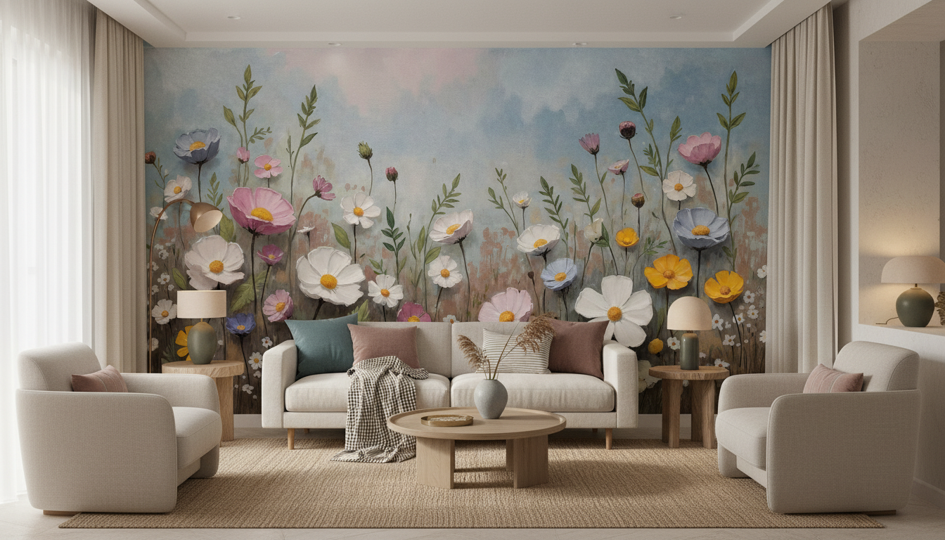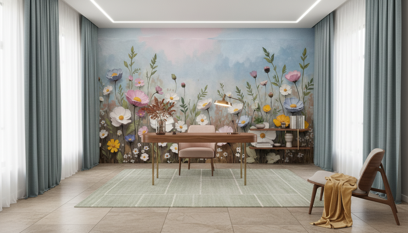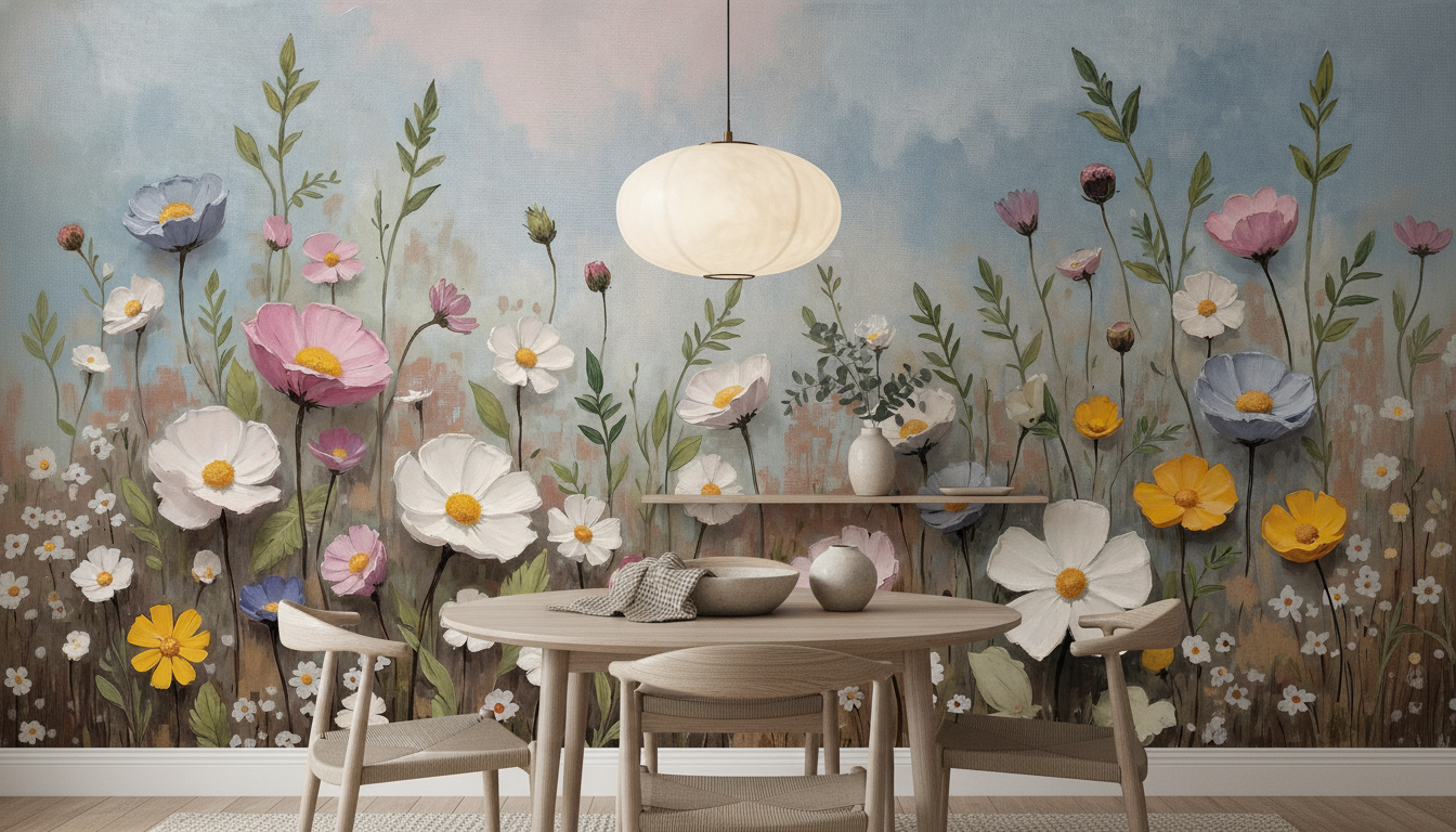 Ce papier peint fleurs des champs révèle un univers botanique d’une beauté saisissante, où se mêlent harmonieusement cosmos blancs, roses poudré, jaunes dorés et bleus lavande. Les fleurs sauvages aux pétales délicatement ourlés s’épanouissent sur de longues tiges élancées, accompagnées de petites marguerites blanches qui ponctuent la composition de leur charme innocent. Les feuillages verts tendres et les tiges élégantes créent un mouvement vertical gracieux, tandis que les boutons fermés ajoutent une note de promesse et de renouveau.