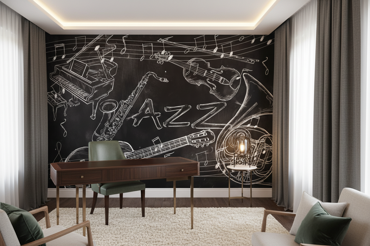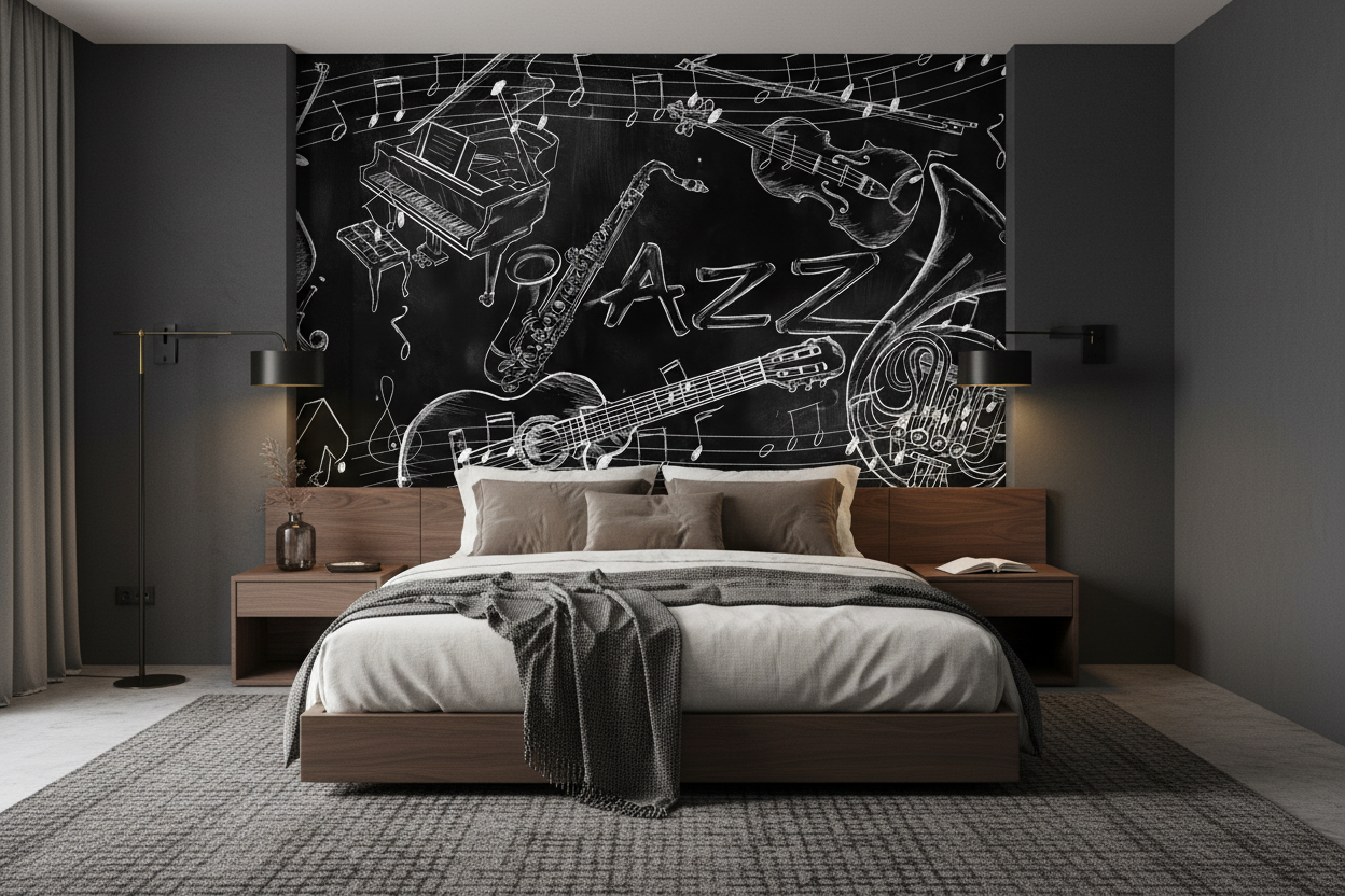 Ce papier peint musical noir et blanc révèle un univers artistique d’une richesse extraordinaire. Sur un fond noir profond se dessinent à la craie blanche tous les symboles d’un orchestre complet : un piano à queue majestueux, un saxophone au galbe sensuel, une guitare acoustique aux courbes délicates, un violon élégant et une trompette éclatante. Le mot « JAZZ » s’affiche fièrement au centre, ancrant cette création dans l’univers musical le plus authentique.