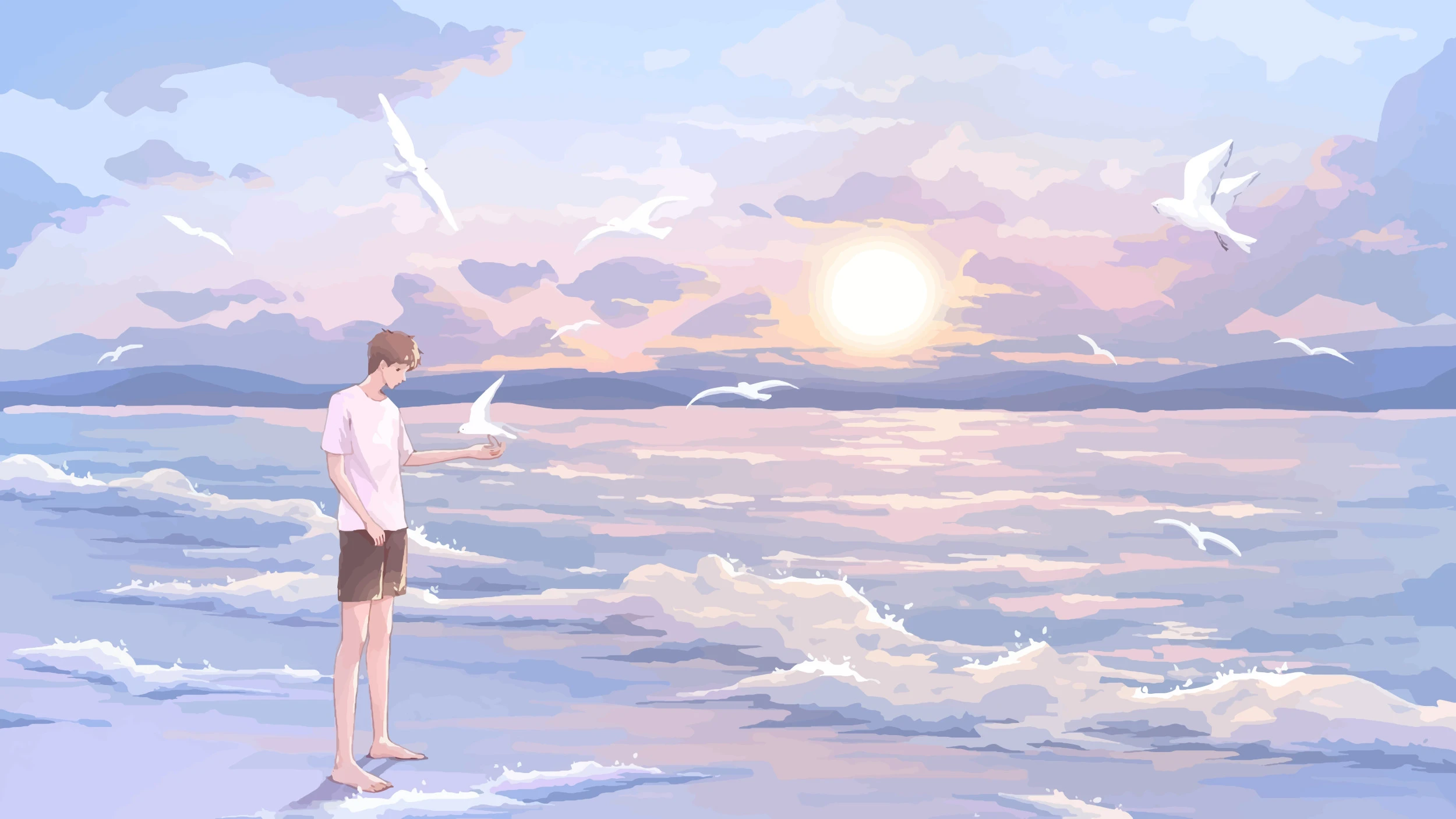 Ce papier peint océanique révèle un univers d’une délicatesse saisissante : un personnage solitaire contemple l’horizon depuis le rivage, tandis que des mouettes gracieuses dansent dans un ciel aux nuances pastel sublimes. L’illustration, réalisée dans un style aquarelle moderne, capture avec une finesse remarquable les reflets dorés du soleil couchant sur les flots apaisés. Les tons lavande, rose poudré et bleu ciel se mêlent harmonieusement aux teintes dorées de cette lumière crépusculaire, créant une symphonie chromatique d’une rare poésie.