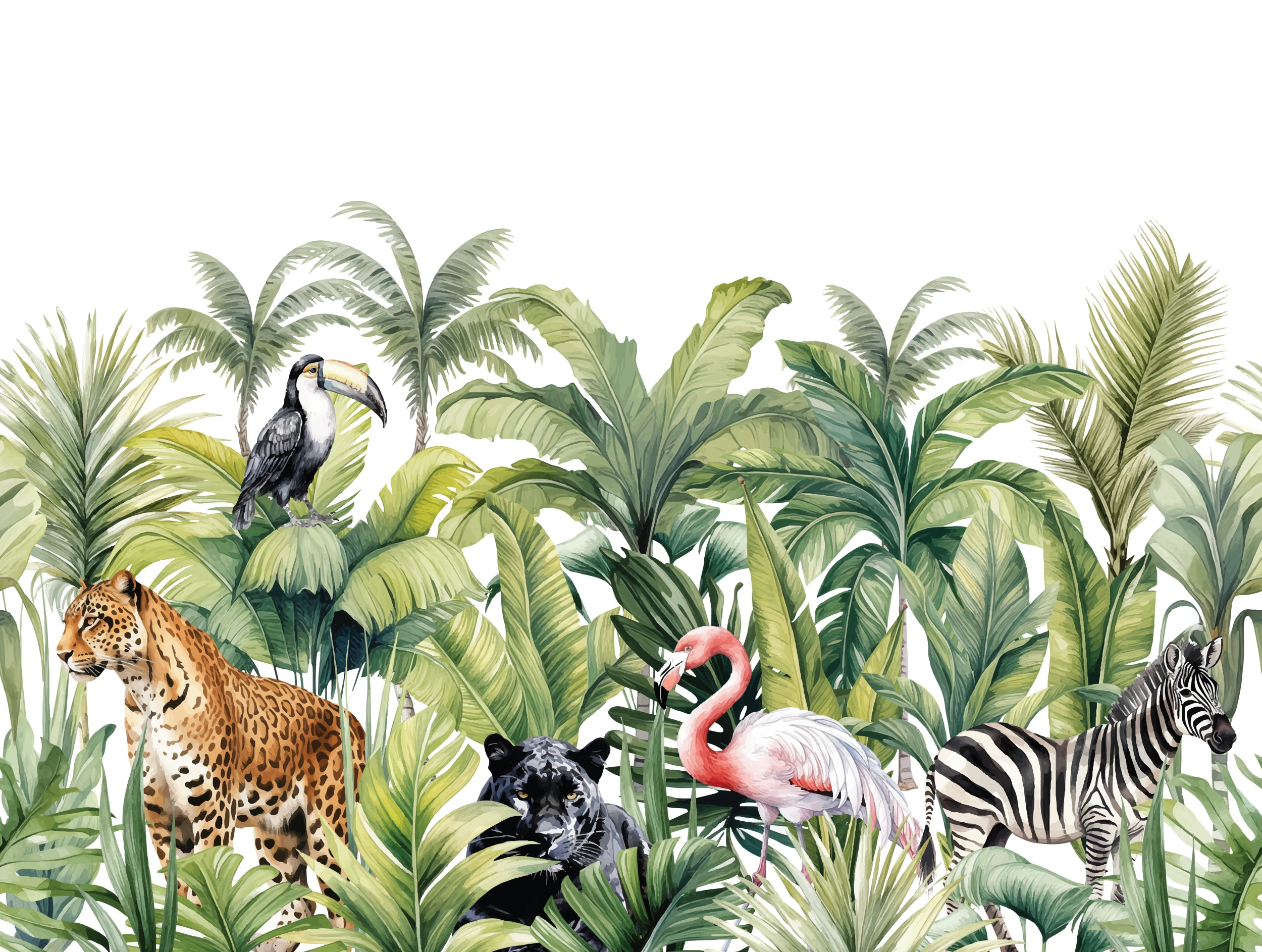 La végétation tropicale se déploie dans toute sa splendeur : palmiers majestueux, feuilles de bananier aux nervures délicatement dessinées, et une profusion de feuillages exotiques qui créent un écrin de verdure sophistiqué. Le style graphique, d’un réalisme artistique saisissant, s’apparente à une aquarelle botanique contemporaine où chaque détail est ciselé avec une précision d’orfèvre.