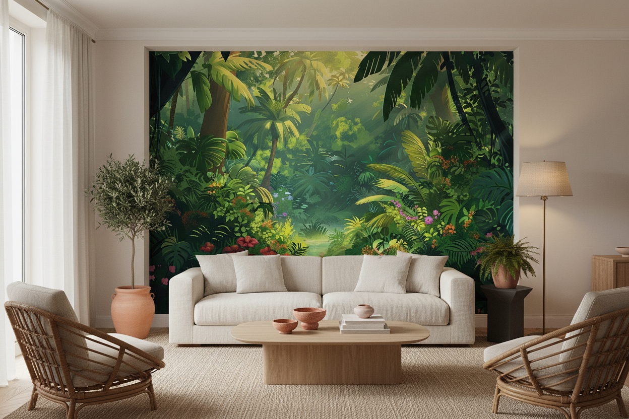 L’artiste a sublimé cette jungle tropicale par une technique picturale sophistiquée, mêlant les nuances avec une maîtrise exceptionnelle. Les verts luxuriants déclinent toute leur palette, du vert émeraude profond au vert tendre lumineux, rehaussés par des tons dorés qui captent la lumière avec poésie. Cette illustration botanique d’inspiration naturaliste transforme chaque pan de mur en fenêtre ouverte sur un paradis végétal préservé.