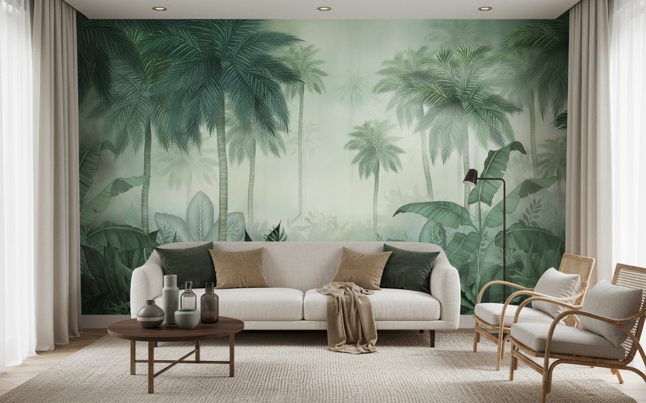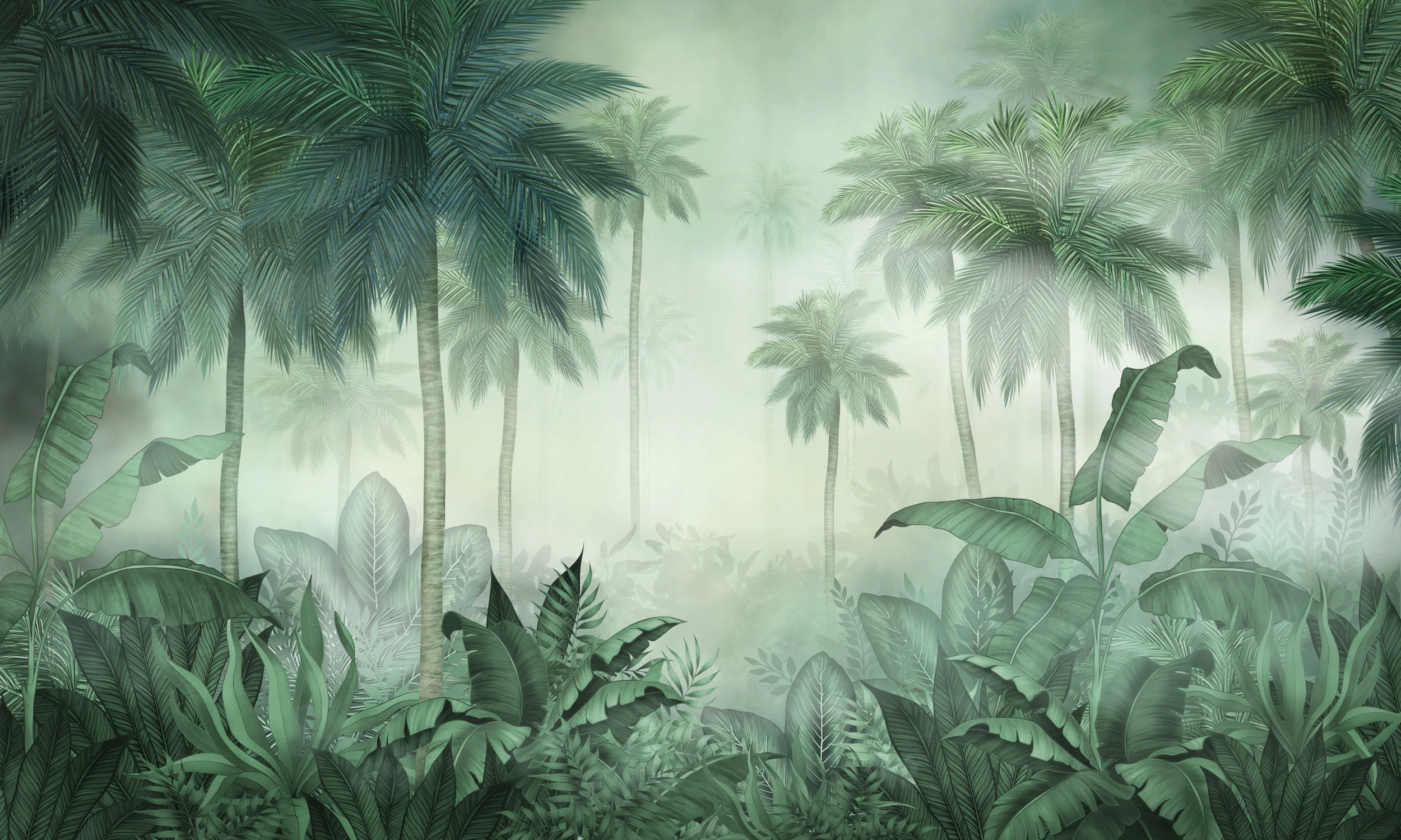 La palette chromatique privilégie des tons verts nuancés, du jade profond au vert tendre, ponctués de beiges dorés et de blancs nacrés. Cette harmonie naturelle crée une atmosphère apaisante, renforcée par l’effet de brume tropicale qui enveloppe délicatement l’ensemble de la composition. Les palmiers en perspective ajoutent une dimension de profondeur remarquable, transformant votre mur en véritable fenêtre ouverte sur un paradis exotique.