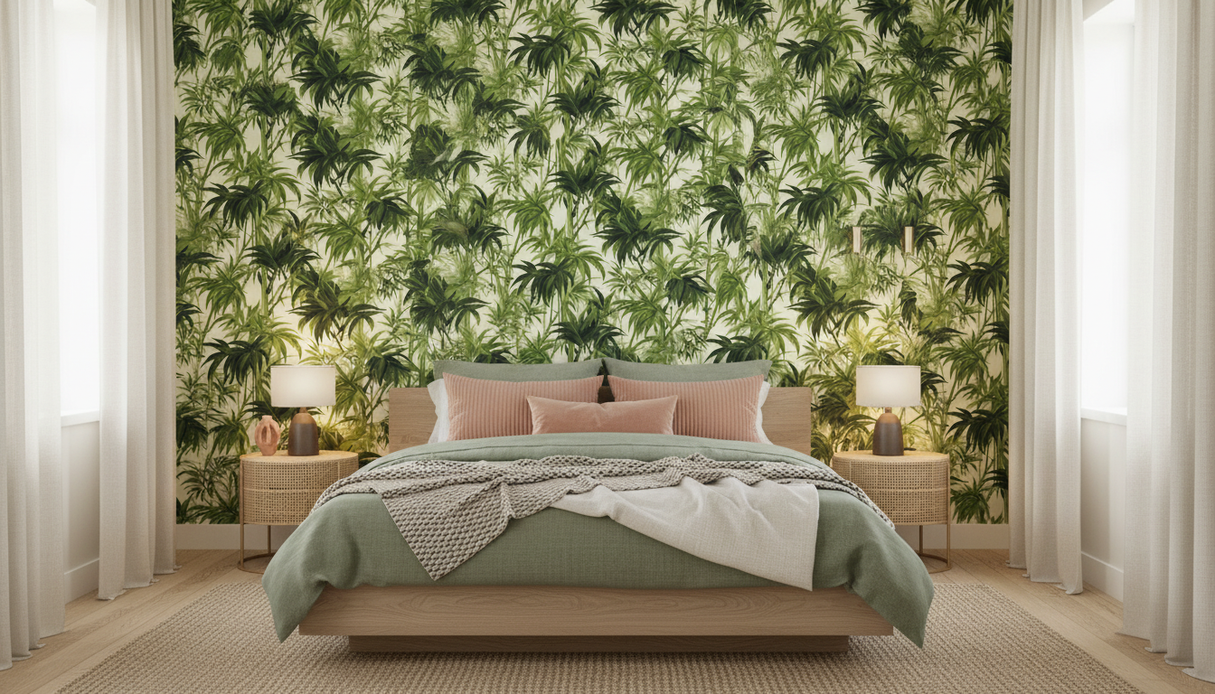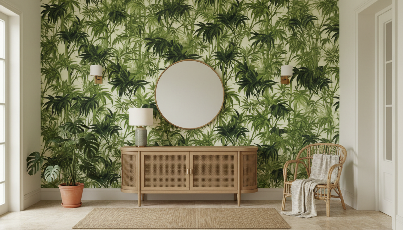 Ce revêtement mural tropical trouve sa place idéale dans un salon contemporain, où il sublimera un pan de mur en créant un point focal saisissant. Dans une chambre parentale, il apportera une touche d’exotisme raffiné, particulièrement harmonieux avec du mobilier en bois naturel, des textiles en lin écru ou des accessoires en rotin tressé. Pour un bureau à domicile, cette décoration murale végétale favorisera la concentration tout en créant un environnement inspirant. Associez-le à des tons neutres comme le blanc cassé, le beige ou le taupe pour un rendu équilibré, ou osez des accents terracotta et ocre pour réchauffer l’ensemble. Des luminaires en laiton doré ou des cadres dorés viendront parfaire cette ambiance tropical chic.