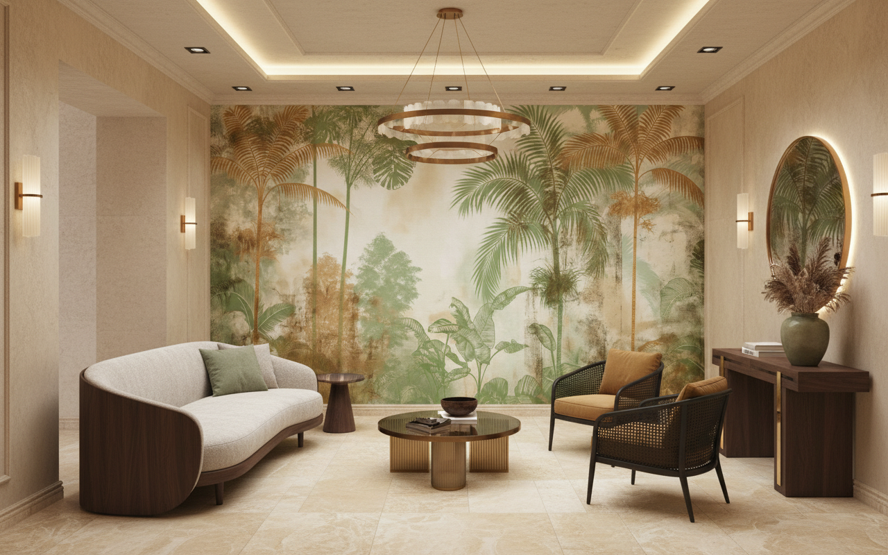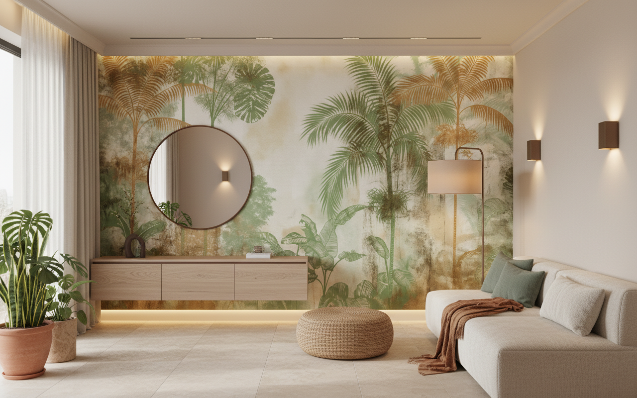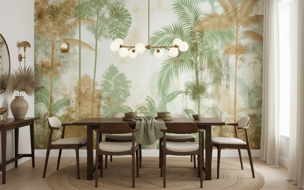 Parfaitement adapté pour sublimer une chambre parentale en quête de sérénité, ce papier peint végétal transformera également un salon moderne en véritable écrin tropical. Dans un bureau, il favorisera la concentration tout en apportant une note d’évasion bienvenue. Associez-le à du mobilier en bois clair, du rotin naturel ou des fibres végétales pour accentuer son caractère organique. Des textiles lin dans les tons crème ou terracotta, des accessoires en laiton brossé et quelques plantes vertes compléteront harmonieusement cette décoration tropicale chic.