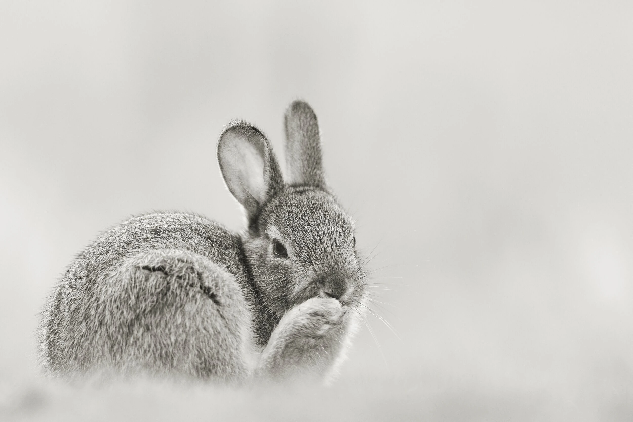 Dans le silence feutré d’un matin d’hiver, un petit lapin se dévoile dans toute sa grâce naturelle, capturé dans un instant de pure tendresse où ses pattes délicates semblent caresser son museau avec une douceur infinie.