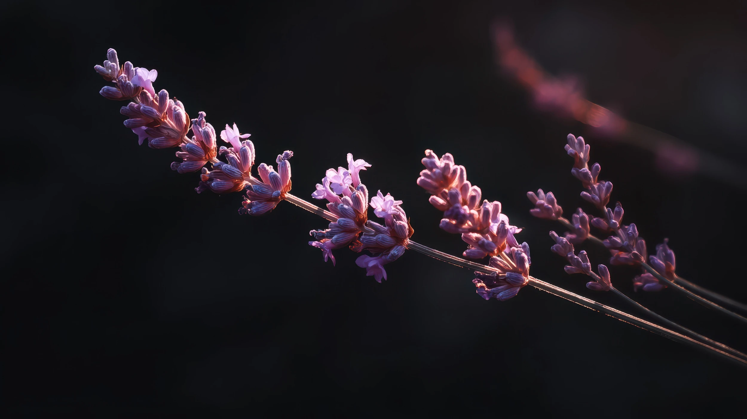 Dans la pénombre dorée d’un jardin secret, des fleurs de lavande s’élèvent comme des flammes violettes, caressées par une lumière mystérieuse qui révèle leurs nuances les plus précieuses.