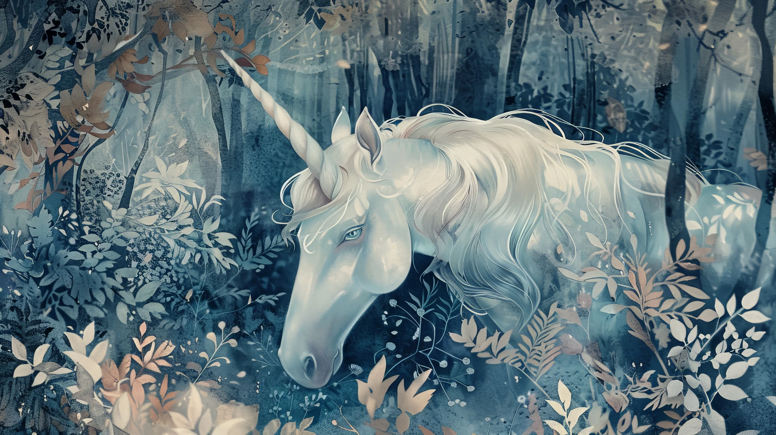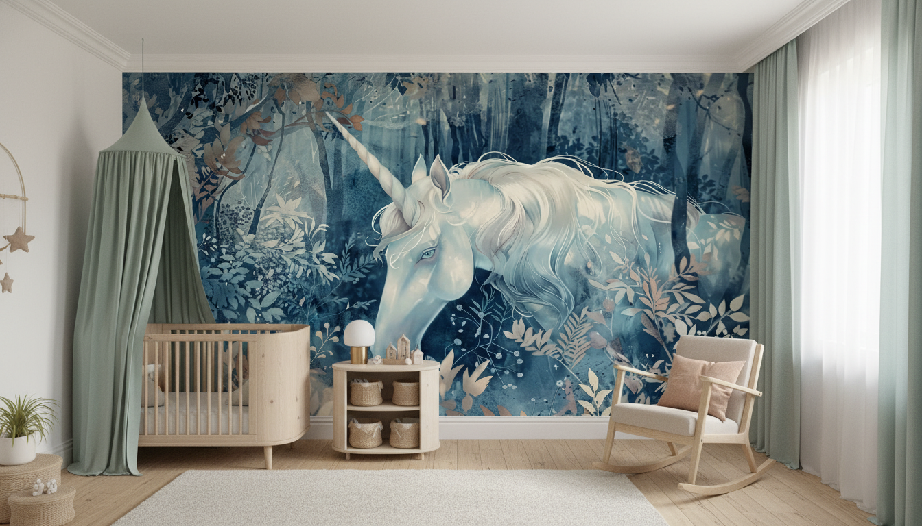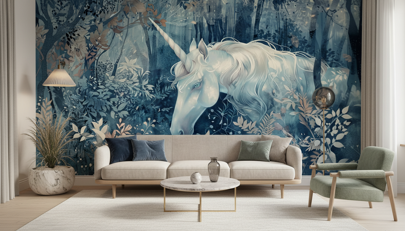 Ce papier peint artistique dévoile un univers onirique d’une beauté saisissante, dominé par la présence majestueuse d’une licorne aux tons bleus et blancs, sa crinière vaporeuse ondulant comme un nuage de soie dans la brise matinale. L’animal mythique évolue au cœur d’une végétation luxuriante aux nuances subtiles, où se mêlent harmonieusement des bleus profonds, des gris perle et des tons dorés délicats. La technique picturale, évoquant l’aquarelle moderne, confère à cette création une dimension poétique exceptionnelle, où chaque feuillage semble caressé par une lumière tamisée.