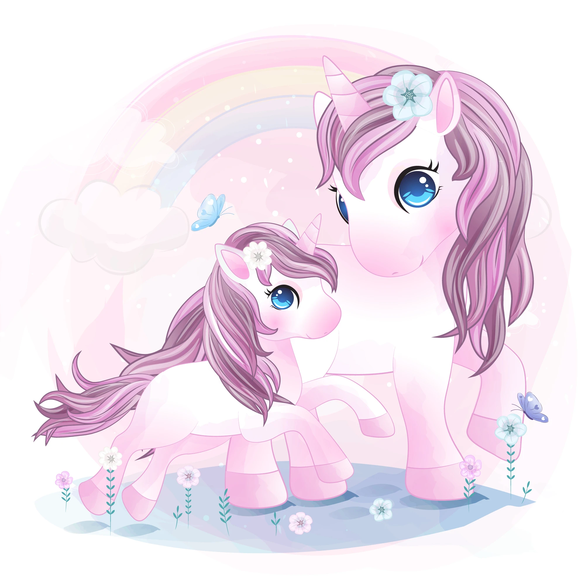 Plongez dans un monde enchanté où la magie prend vie sous les couleurs tendres d’un arc-en-ciel pastel, où deux gracieuses licornes roses évoluent dans un univers de douceur infinie et de rêverie enfantine.