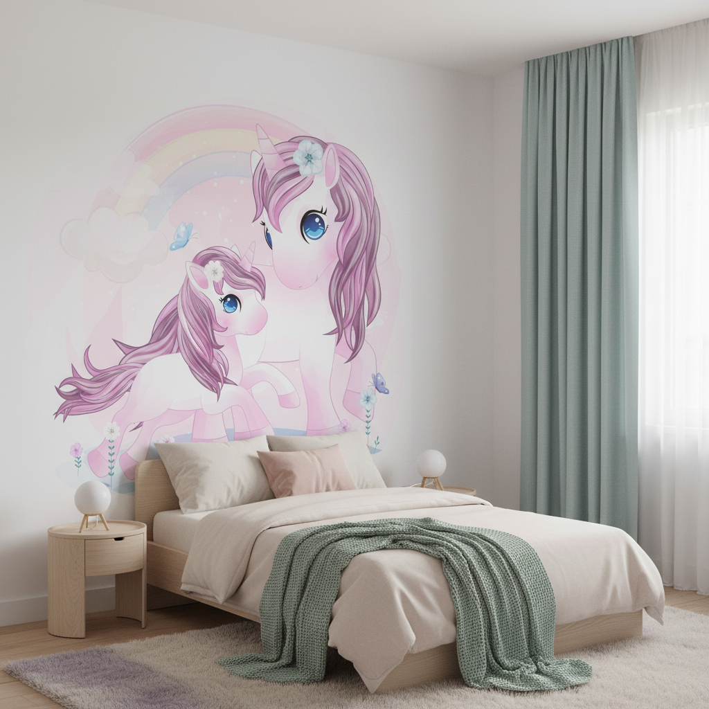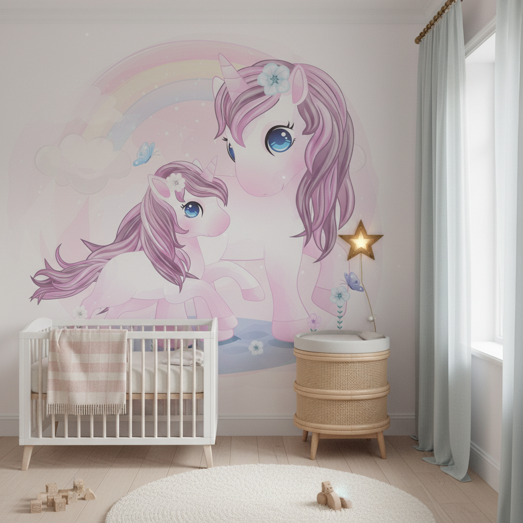 Ce papier peint licorne révèle un tableau féérique d’une beauté saisissante : une majestueuse licorne adulte veille tendrement sur son petit, tous deux ornés d’une crinière violette aux reflets nacrés qui ondule comme de la soie. Leurs yeux bleus cristallins pétillent de malice et de bienveillance, tandis que de délicates fleurs blanches parent leurs fronts comme de précieux diadèmes. L’illustration, réalisée dans un style graphique moderne aux influences manga, mélange subtilement les techniques d’aquarelle digitale et de dessin vectoriel pour créer une œuvre d’une finesse remarquable. La palette de couleurs pastel se décline en nuances de rose poudré, violet lavande et blanc nacré, sublimées par un arc-en-ciel aux tons poudrés qui traverse harmonieusement la composition.