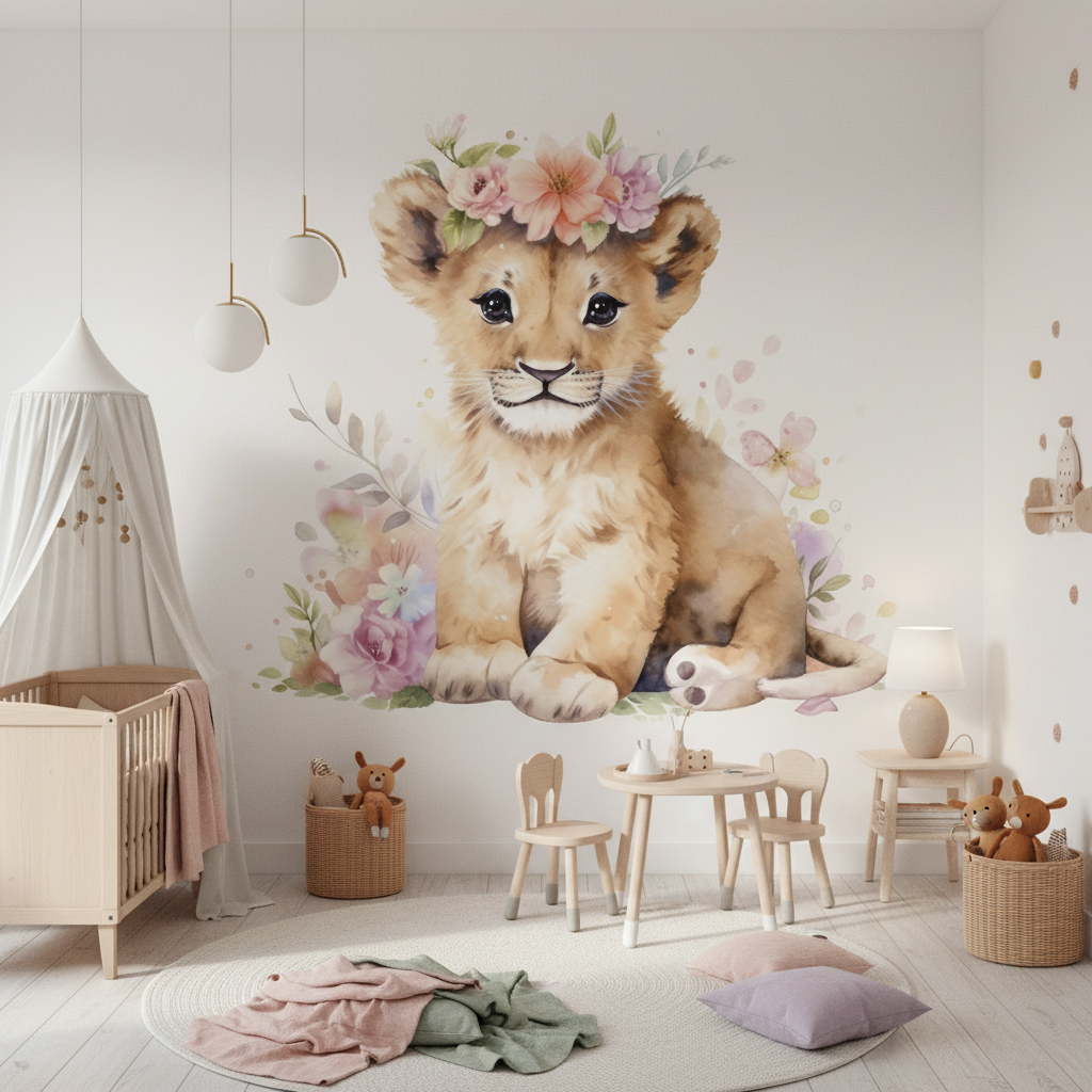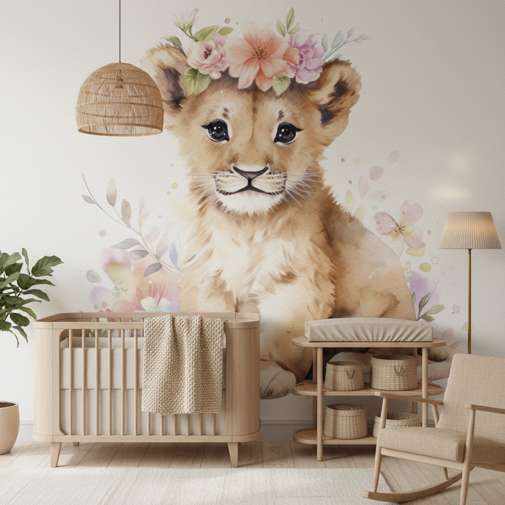 Ce papier peint animalier révèle un adorable lionceau aux yeux pétillants, couronné d’une délicate parure de fleurs aquarelle aux teintes poudrées. L’artiste a sublimé ce portrait animalier grâce à une technique d’aquarelle moderne, où chaque coup de pinceau capture la douceur du pelage fauve et la profondeur du regard noir. Les nuances pastel – rose tendre, pêche délicat, lavande subtil – s’épanouissent en couronne florale, créant un contraste saisissant avec les tons chauds dorés de la crinière naissante.