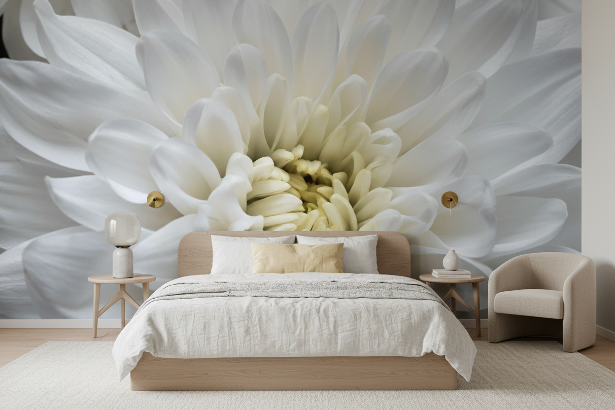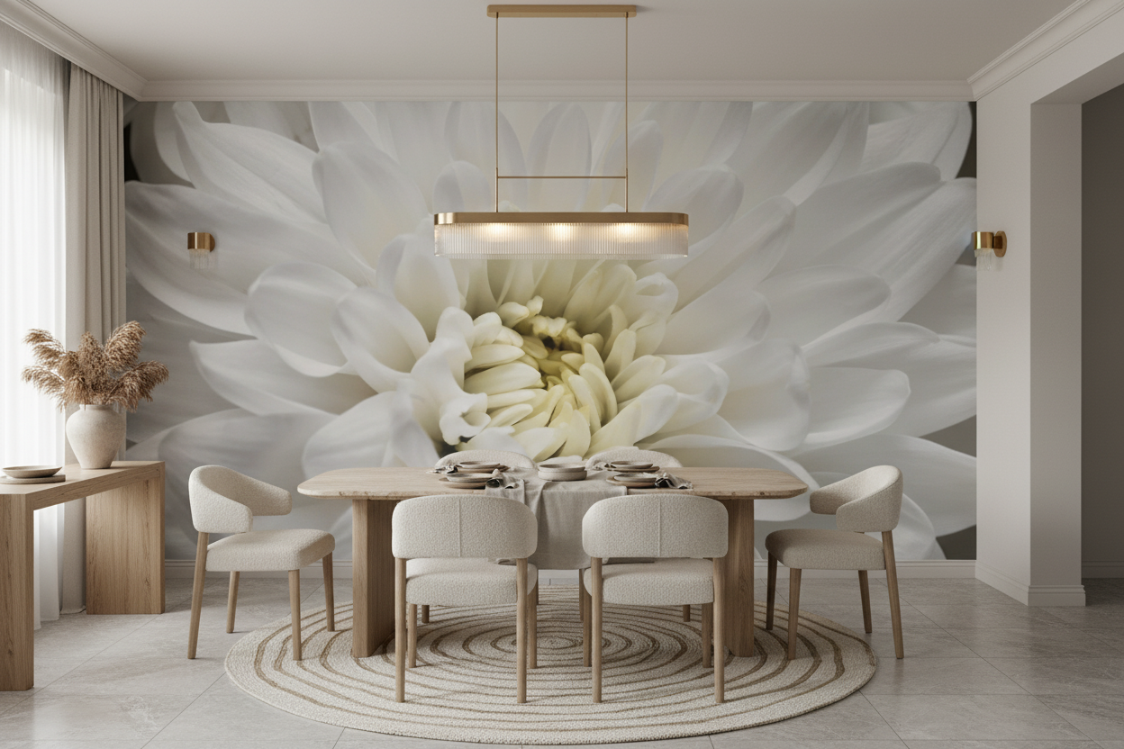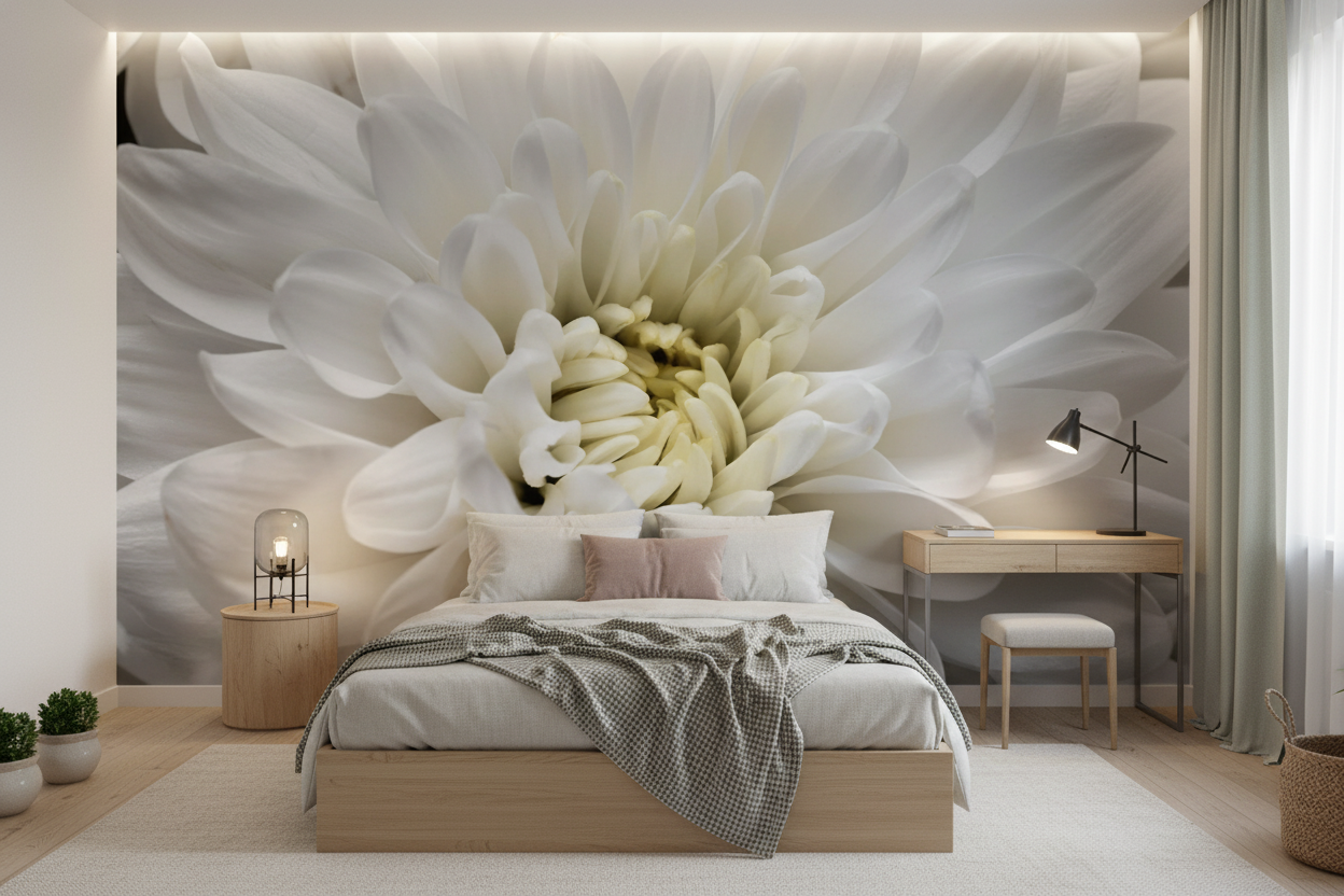 L’atmosphère qui émane de ce papier peint blanc est d’une douceur incomparable. Cette fleur géante diffuse une énergie apaisante et raffinée, créant instantanément un cocon de bien-être dans votre intérieur. La pureté de ses tons et la délicatesse de ses formes génèrent une ambiance zen et sophistiquée, propice à la détente et à l’inspiration. Cette composition florale monumentale transforme l’espace en sanctuaire de beauté, où règnent harmonie et élégance naturelle.