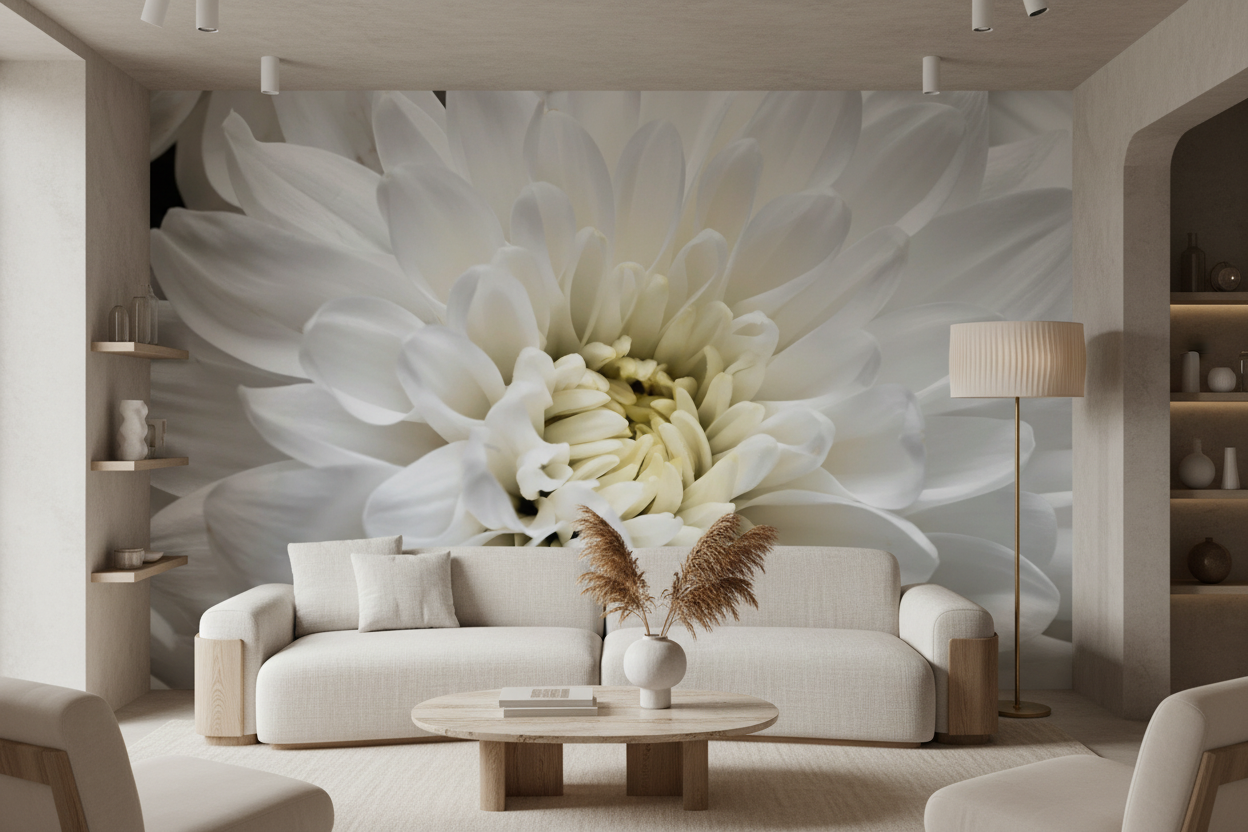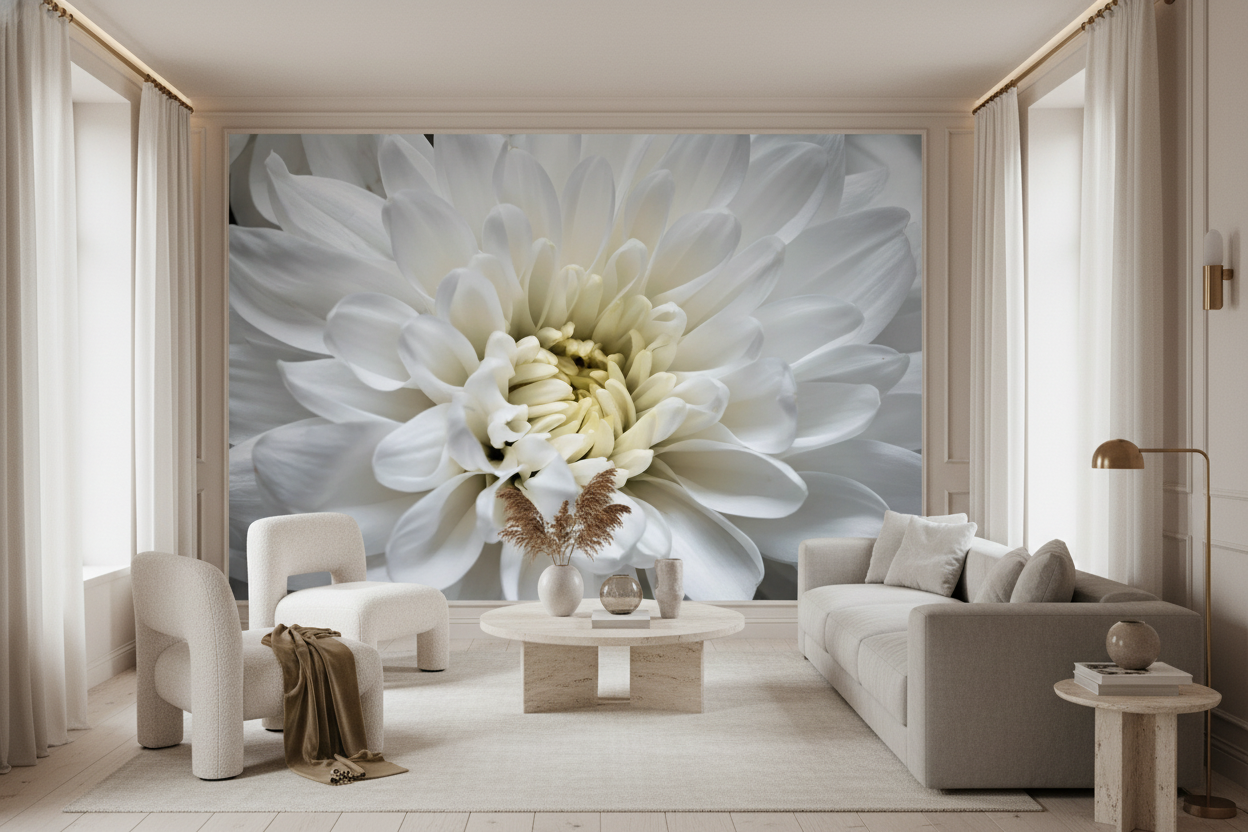 Ce papier peint floral révèle une photographie macro d’exception, capturant dans ses moindres détails la splendeur d’une dahlia blanc aux dimensions spectaculaires. Chaque pétale, finement ciselé par la nature, se dévoile dans une palette de nuances ivoire et blanc nacré, sublimée par des reflets jaune pâle au cœur de la corolle. La technique photographique ultra-précise révèle la texture veloutée des pétales, leurs courbes gracieuses et l’architecture parfaite de cette merveille botanique. Le style contemporain de cette création allie réalisme saisissant et esthétique épurée, transformant votre mur en véritable œuvre d’art florale.