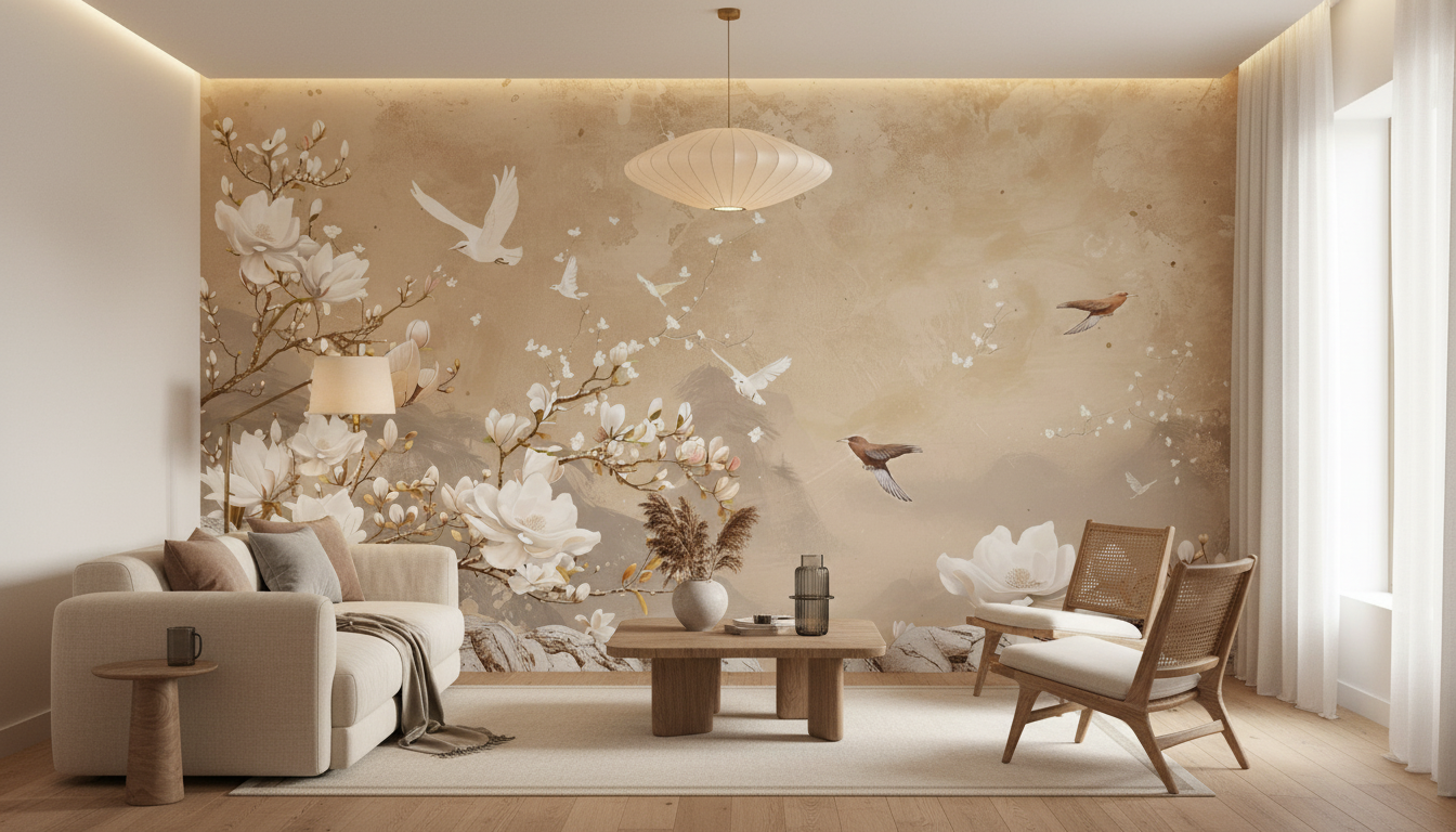 Ce papier peint magnolia trouve sa place idéale dans une chambre parentale, où il créera une ambiance cocooning propice au repos. Il sublimera également un salon zen ou un bureau en quête de sérénité. Pour magnifier son effet décoratif, associez-le à du mobilier en bois clair, des textiles en lin naturel et des accessoires en céramique blanche. Les matières brutes comme le rotin ou le bambou s’harmoniseront parfaitement avec cette esthétique naturelle et raffinée.