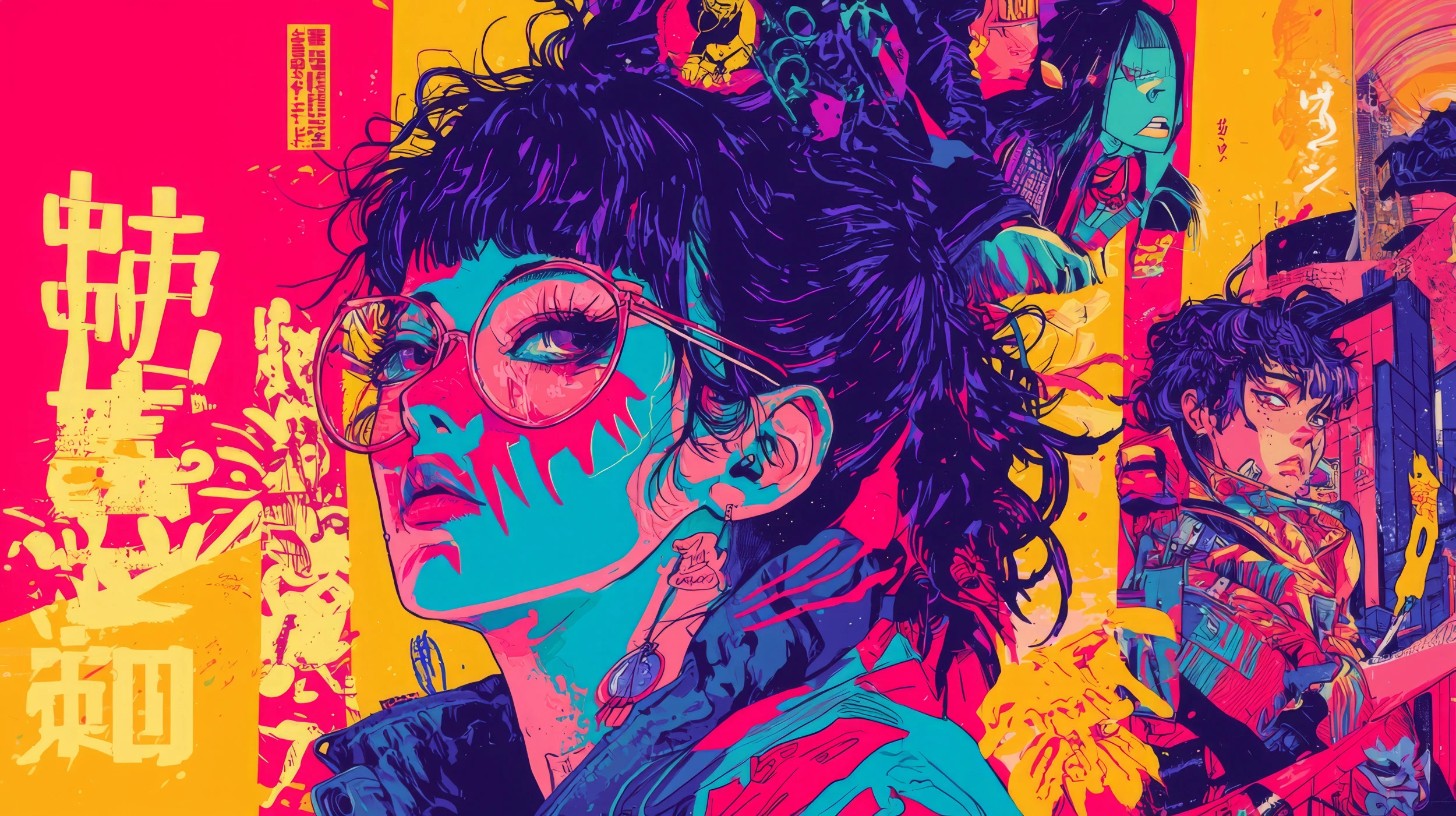 Ce papier peint manga exceptionnel révèle un portrait saisissant aux influences cyberpunk et pop art. Le personnage central, paré de lunettes rondes iconiques et d’une chevelure violette ébouriffée, émerge d’un kaléidoscope de tons néon : rose fuchsia, jaune électrique, turquoise vibrant et violet profond. Le style graphique, inspiré de l’art urbain japonais et des illustrations manga, mélange habilement les techniques de sérigraphie et de peinture numérique pour créer une œuvre d’une intensité visuelle remarquable.