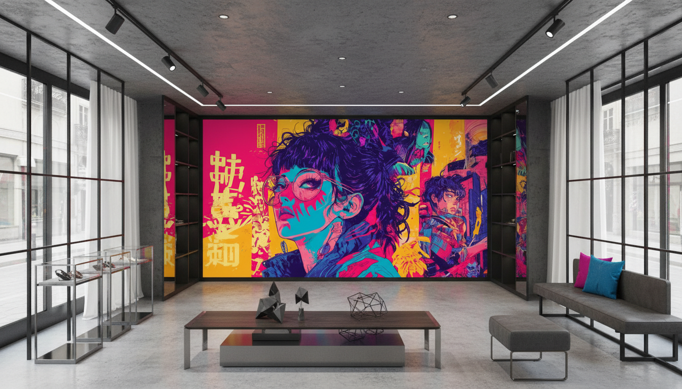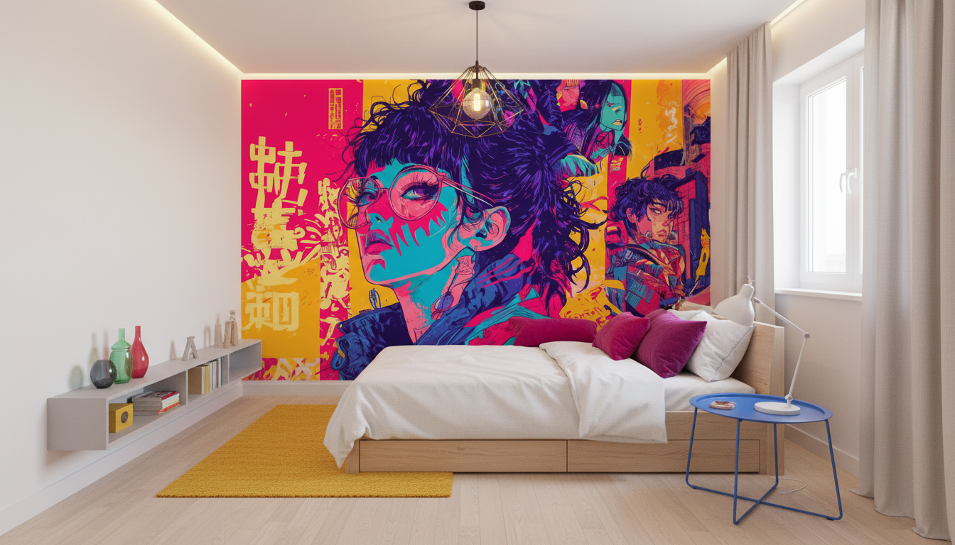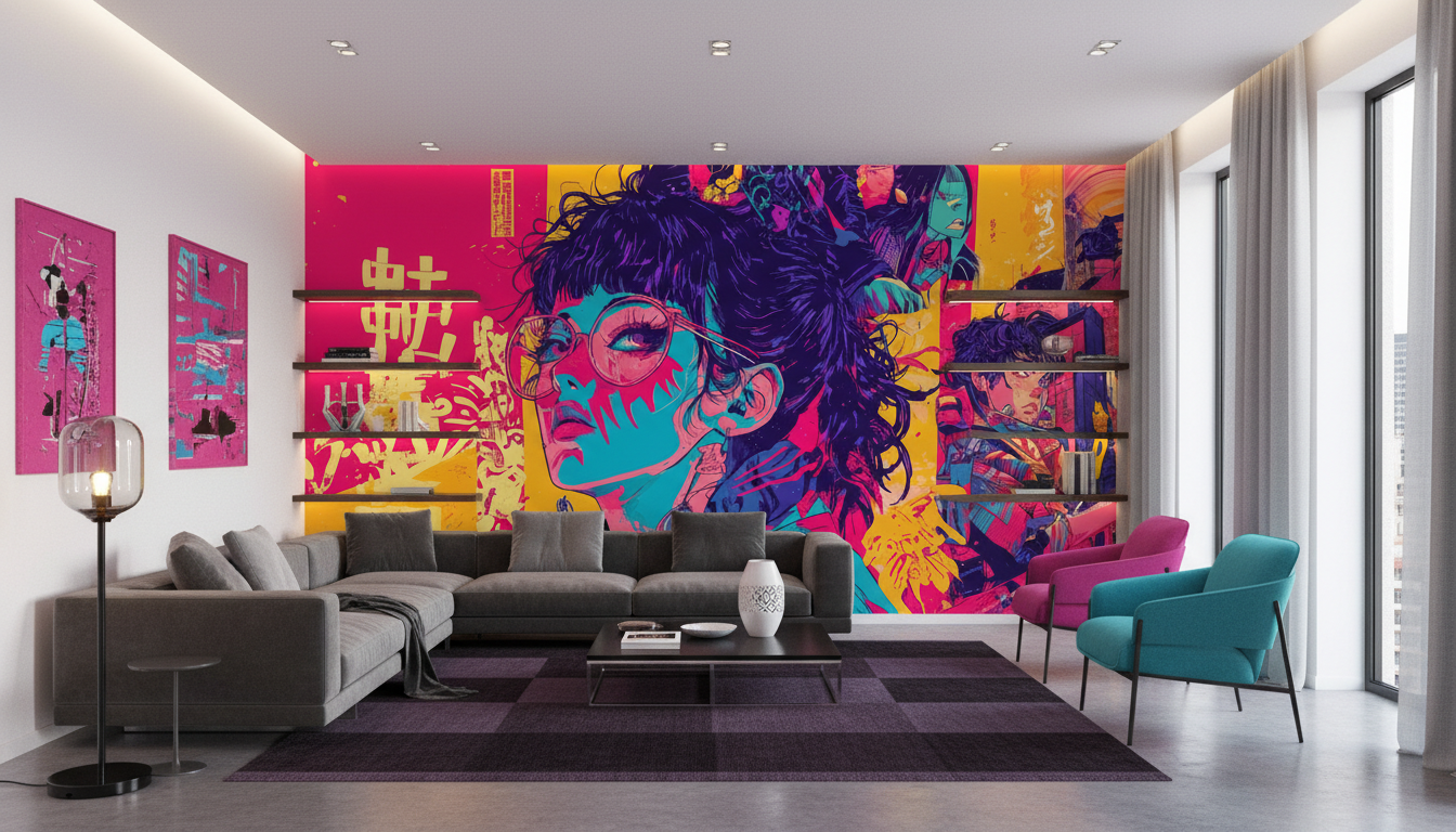 Papier peint manga, pop art et cyberpunk aux couleurs néon. Transformez votre intérieur en galerie d’art urbain Néo-Tokyo. Une fresque murale vibrante et sur mesure pour un impact unique.