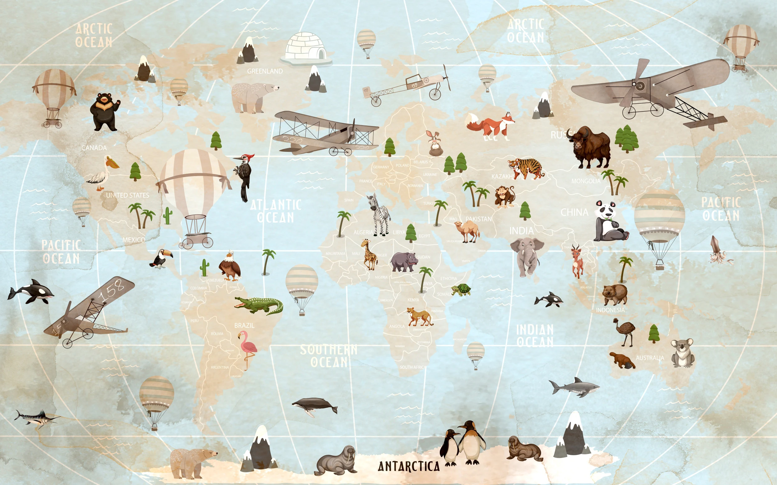 Cette carte du monde décorative déploie un univers graphique d’une richesse exceptionnelle, mêlant avec poésie la précision cartographique et l’imaginaire de l’exploration. Sur un fond aux tons beiges et bleus poudrés, se dessinent les contours des continents parsemés d’une faune extraordinaire : ours polaires majestueux du Groenland, pandas espiègles de Chine, éléphants paisibles d’Afrique, et pingouins élégants d’Antarctique. Des montgolfières vintage flottent gracieusement dans les airs, tandis que d’authentiques avions d’époque traversent les océans, rappelant les premiers pionniers de l’aviation.