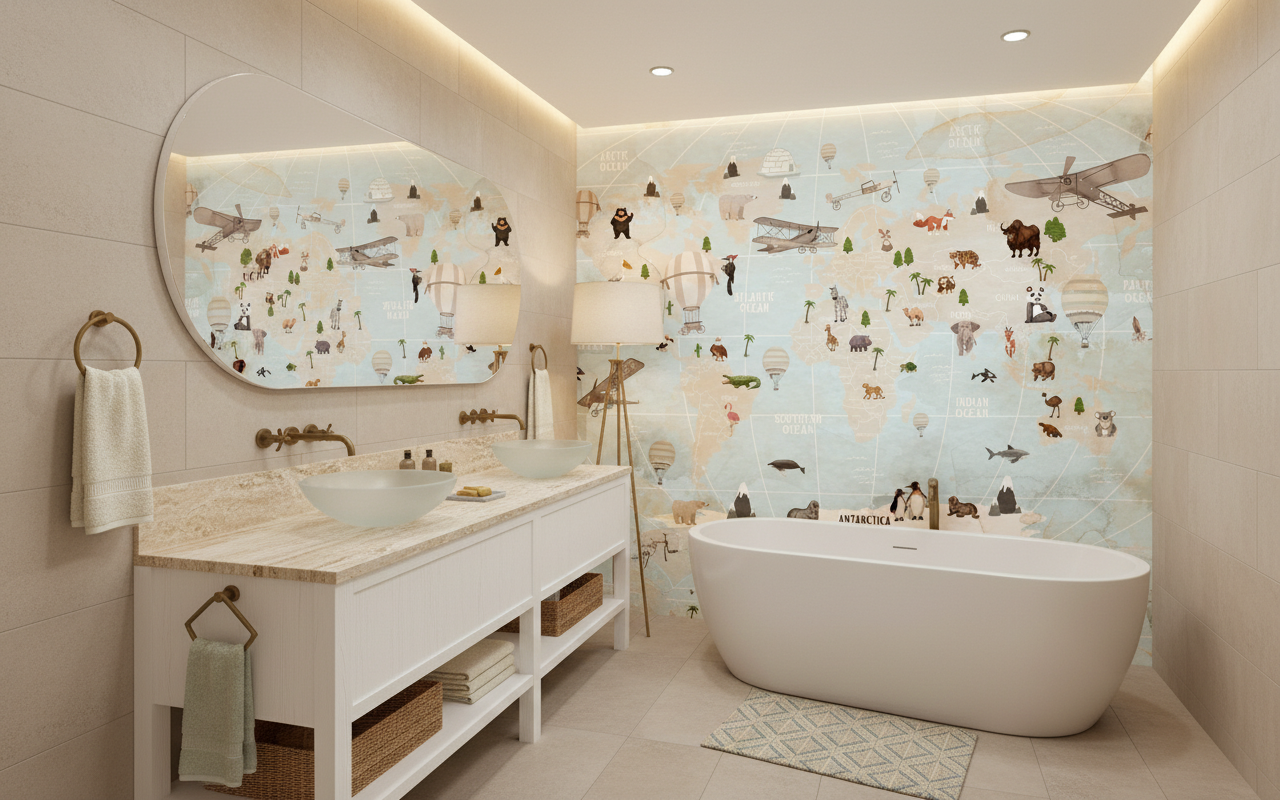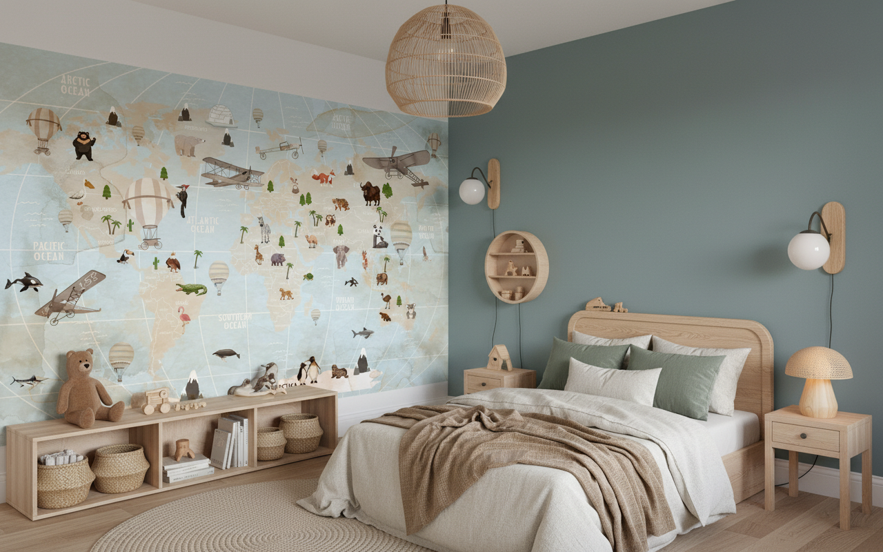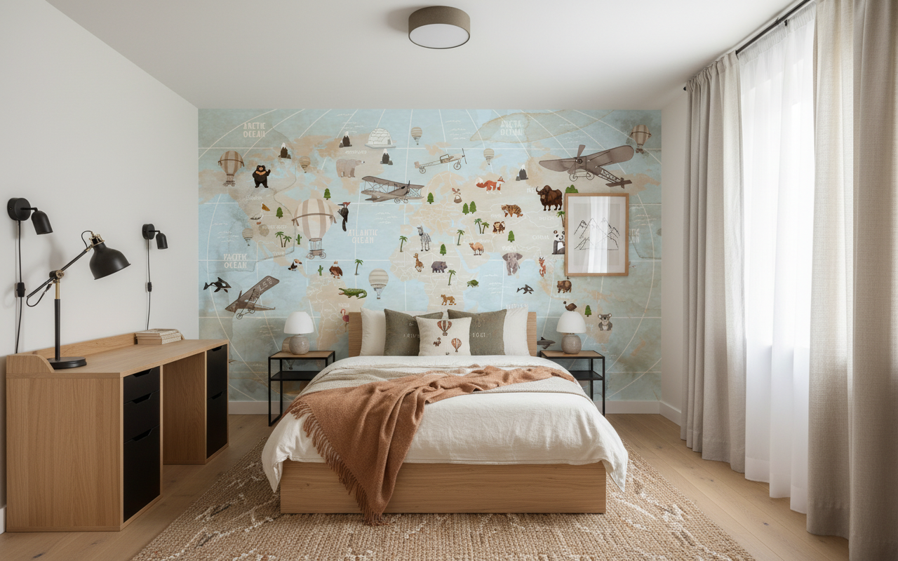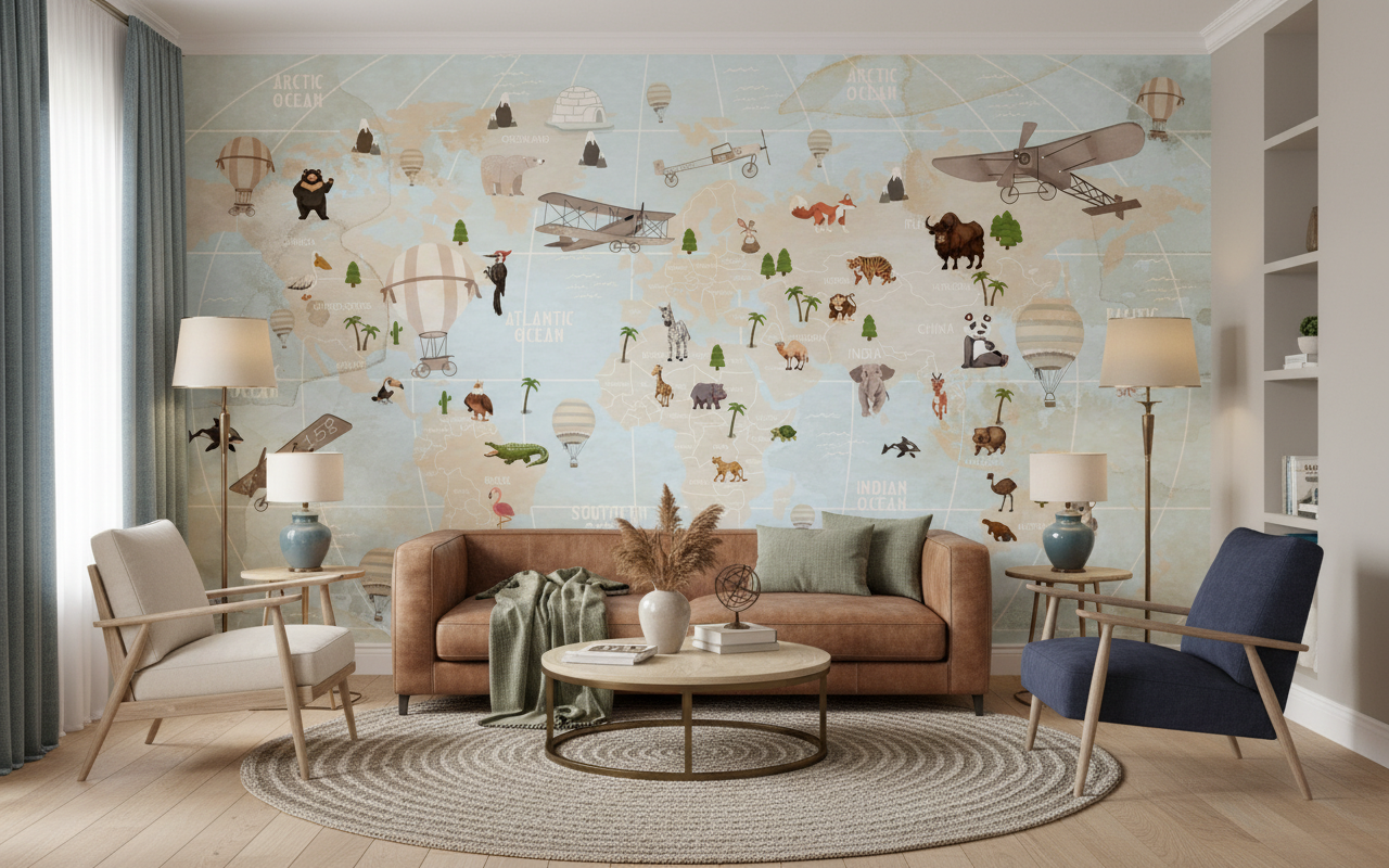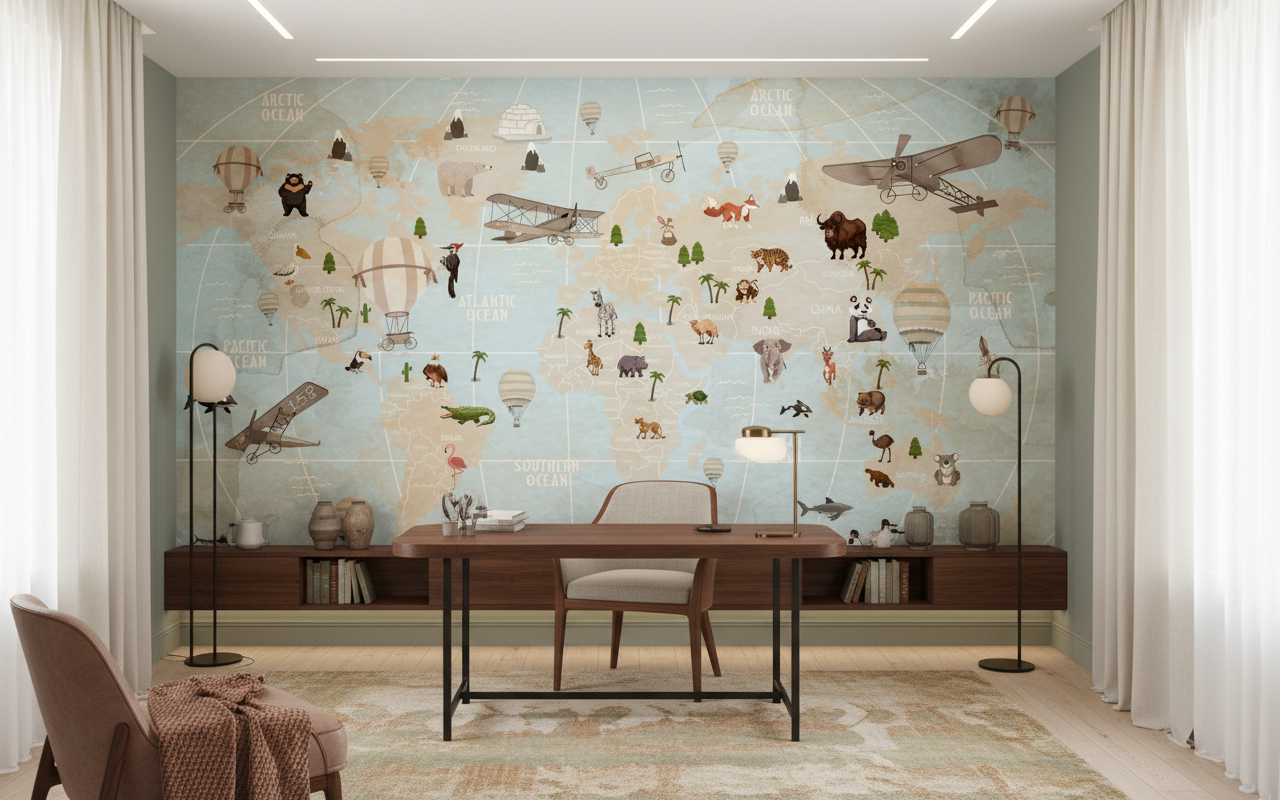 Évadez-vous avec ce papier peint mappemonde vintage et ses adorables animaux. Parfait pour une chambre d’enfant ou un bureau d’explorateur. Une décoration murale sur mesure qui invite au voyage et à la découverte.