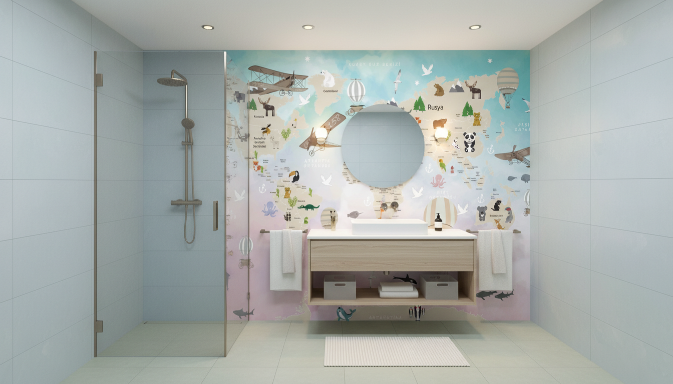 Dans un salon familial, ce papier peint panoramique crée un formidable point focal, invitant aux conversations sur les voyages et les cultures du monde. Les nuances pastel s’accordent parfaitement avec une décoration scandinave ou bohème chic, apportant caractère et personnalité sans jamais surcharger l’espace.
