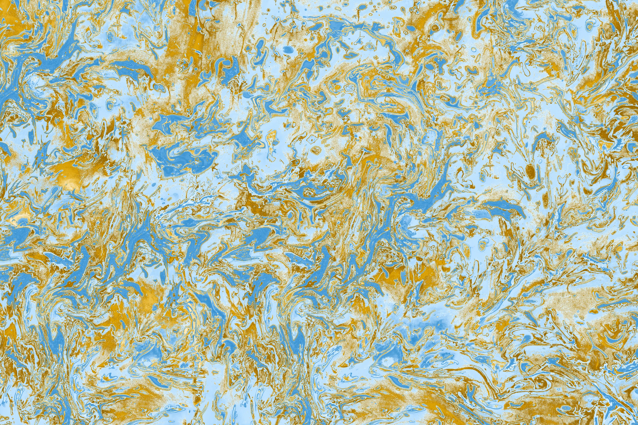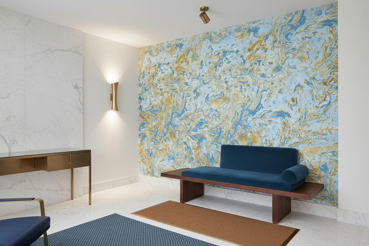 Ce papier peint marbré exceptionnel révèle un univers fascinant où l’art du marbling atteint ses plus nobles expressions. Les veines dorées serpentent avec grâce à travers un fond bleu azur lumineux, créant des motifs organiques d’une complexité hypnotique. Cette technique de marbrure traditionnelle, sublimée par une palette chromatique raffinée, évoque les manuscrits précieux d’antan et les reliures d’art les plus recherchées. Les nuances dorées se déclinent du jaune miel au bronze profond, tandis que les tons bleus varient du ciel tendre au cobalt intense, offrant une richesse visuelle d’une profondeur remarquable.