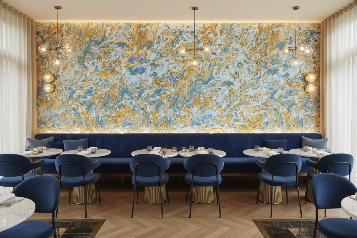 L’effet marbré abstrait de ce revêtement mural crée des formes fluides et organiques qui évoquent tantôt les remous d’une rivière dorée, tantôt les volutes d’un nuage précieux. Cette esthétique baroque moderne apporte une dimension théâtrale et luxueuse à l’espace, transformant chaque mur en galerie d’art contemporain.