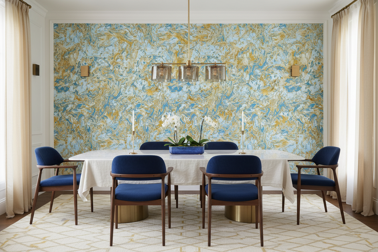 Ce papier peint décoratif haut de gamme trouvera sa place idéale dans un salon contemporain, où il constituera un point focal saisissant derrière un canapé en velours bleu nuit ou des fauteuils en cuir cognac. Dans une chambre parentale, il créera une ambiance cocooning luxueuse, particulièrement mis en valeur par du mobilier en bois doré et des textiles en soie. Un bureau ou library bénéficiera également de cette esthétique inspirante, favorisant la créativité et la concentration. Associez-le à des matières nobles comme le laiton brossé, le marbre blanc veiné, ou encore des tissus en lin naturel pour créer une harmonie parfaite. Les luminaires dorés et les accessoires en cristal sublimeront cette décoration d’exception.