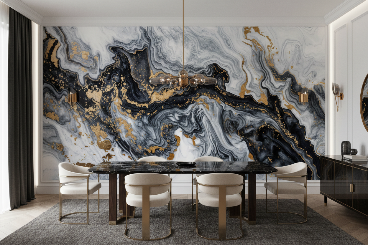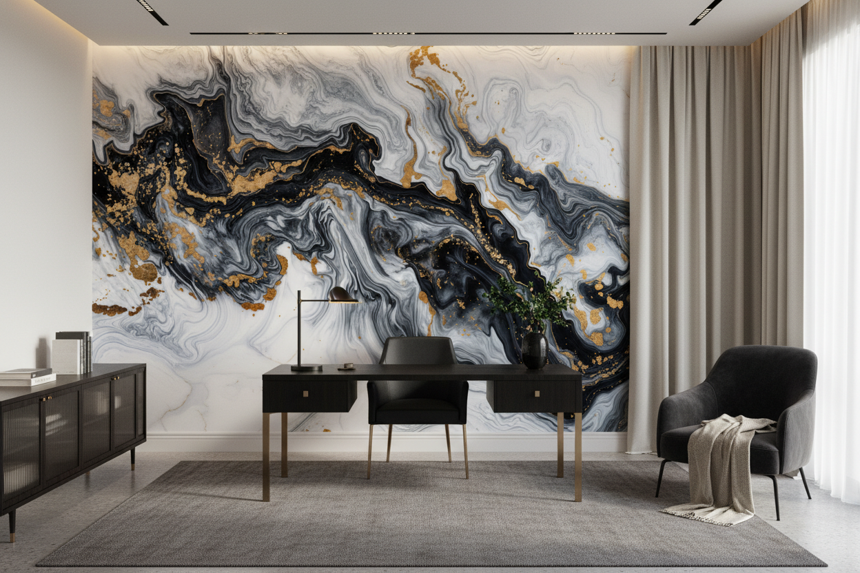 Transformez votre espace avec ce papier peint marbre fluide. Ses veines abstraites noir, blanc et or créent une ambiance luxueuse et moderne. Une décoration murale sur mesure, expression de l’art de vivre.