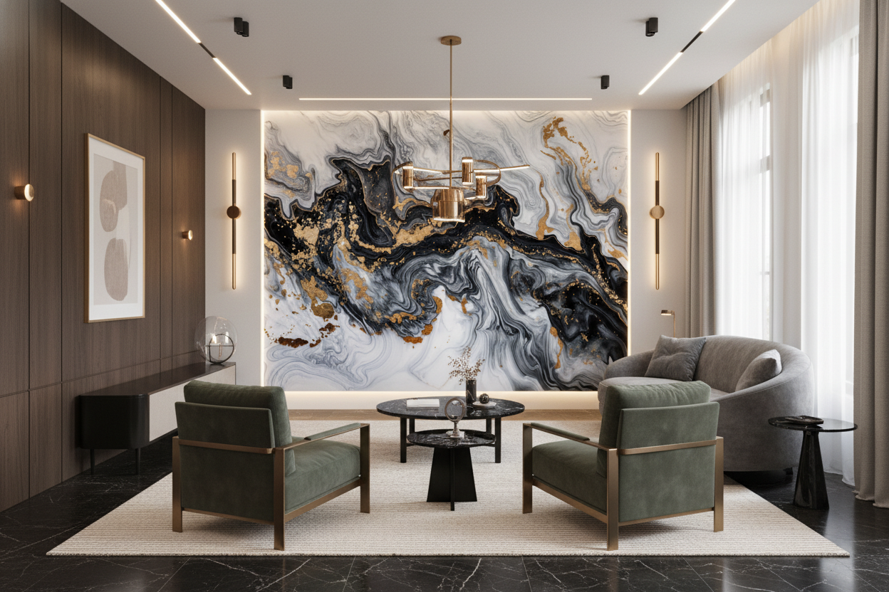 Ce papier peint design trouve sa place idéale dans un salon moderne où il sublimera un pan de mur derrière un canapé en velours anthracite ou une bibliothèque en noyer. Dans une chambre parentale, il créera une tête de lit spectaculaire, particulièrement mise en valeur par des luminaires en laiton brossé. L’bureau contemporain bénéficiera également de cette ambiance inspirante, favorisant créativité et concentration. Associez-le à des matières naturelles comme le bois brut, le lin écru ou des éléments en marbre véritable pour créer un dialogue harmonieux entre authenticité et modernité. Les accessoires dorés – miroirs, cadres, ou luminaires – viendront faire écho aux veines précieuses du papier peint.