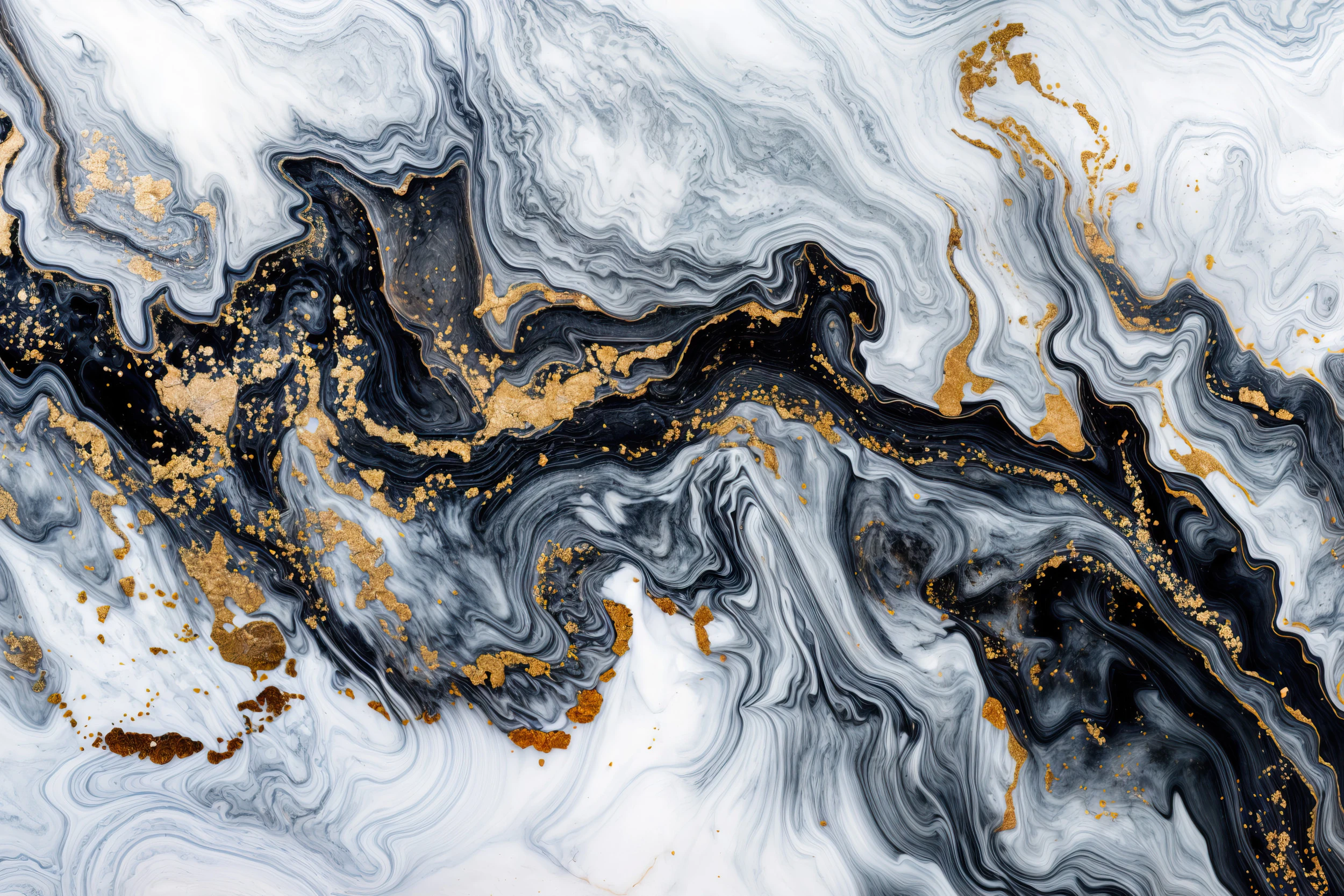 Papier Peint Marbre Fluide Noir Blanc Or Luxueux Abstrait