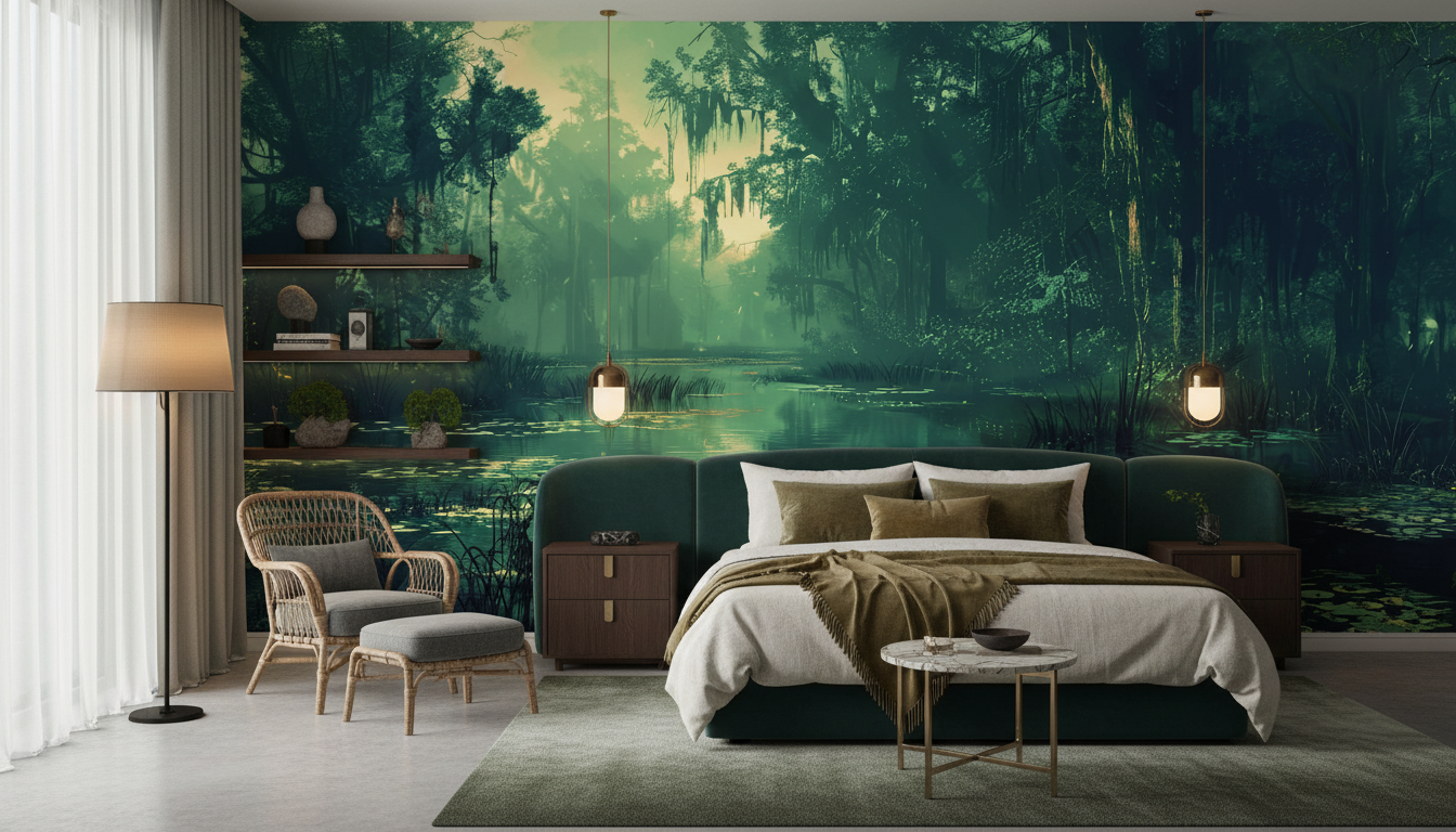 Cette décoration murale nature insuffle instantanément une atmosphère apaisante et contemplative à votre intérieur. Le papier peint crée une ambiance zen et ressourçante, évoquant la sérénité des bayous américains ou des jardins botaniques secrets. L’effet d’immersion est saisissant : on se croie transporté dans un sanctuaire naturel où le temps s’arrête, bercé par le clapotis invisible de l’eau et le bruissement des feuillages.