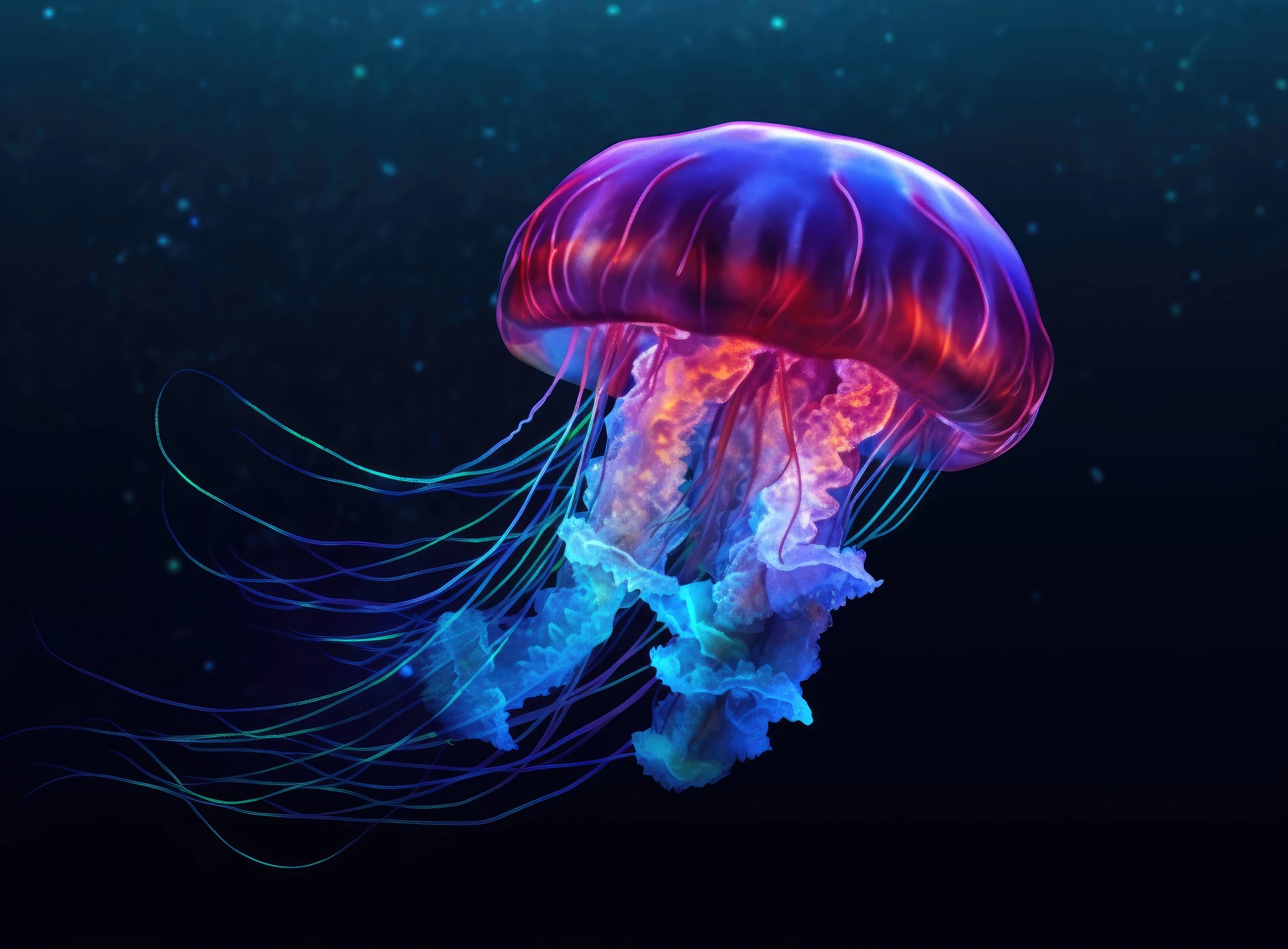Ce papier peint méduse luminescente capture avec un réalisme époustouflant la grâce hypnotique d’une majestueuse méduse évoluant dans les abysses. Son ombrelle translucide aux reflets pourpres et violets se déploie comme une œuvre d’art vivante, tandis que ses tentacules éthérés ondulent dans un ballet aquatique infini. Les nuances électriques allant du bleu cyan au rose fuchsia créent un spectacle chromatique d’une intensité rare, sublimé par des effets de bioluminescence qui semblent pulser de vie. Le fond marin sombre parsemé d’étoiles lumineuses évoque la vastitude infinie des océans profonds, conférant à cette illustration digitale une dimension cosmique fascinante.