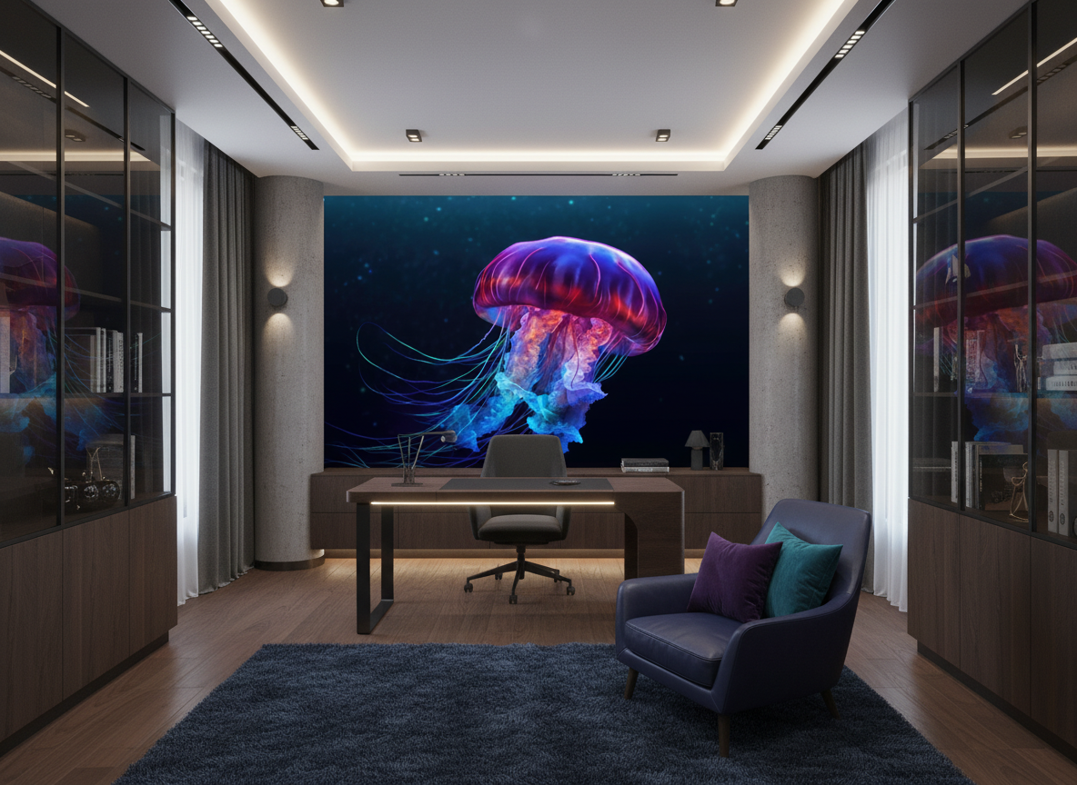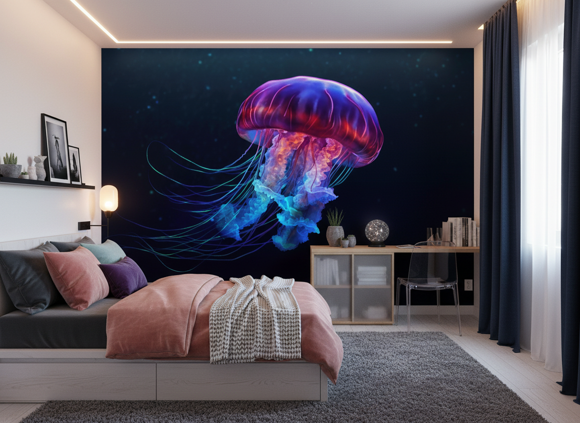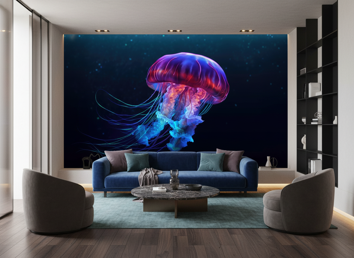 Papier peint méduse luminescente : créez un sanctuaire aquatique. Nuances bleu violet néon pour une ambiance zen moderne. Fabrication sur mesure pour votre intérieur d’exception.