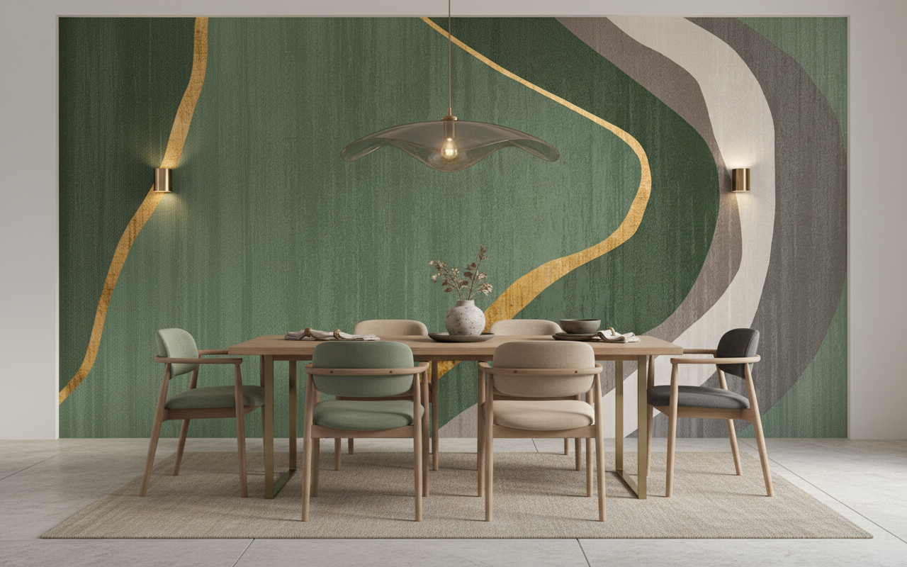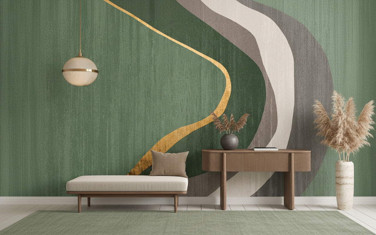 L’âme de ce papier peint design réside dans sa capacité à insuffler une atmosphère de sérénité contemporaine et de raffinement discret. Les couleurs naturelles – ce vert sauge profond, ces beiges poudrés et cet or délicat – créent un cocon apaisant qui invite à la détente et à la contemplation. Cette palette chromatique évoque l’harmonie d’un style scandinave chic teinté d’influences japonisantes, où la simplicité rencontre la sophistication.